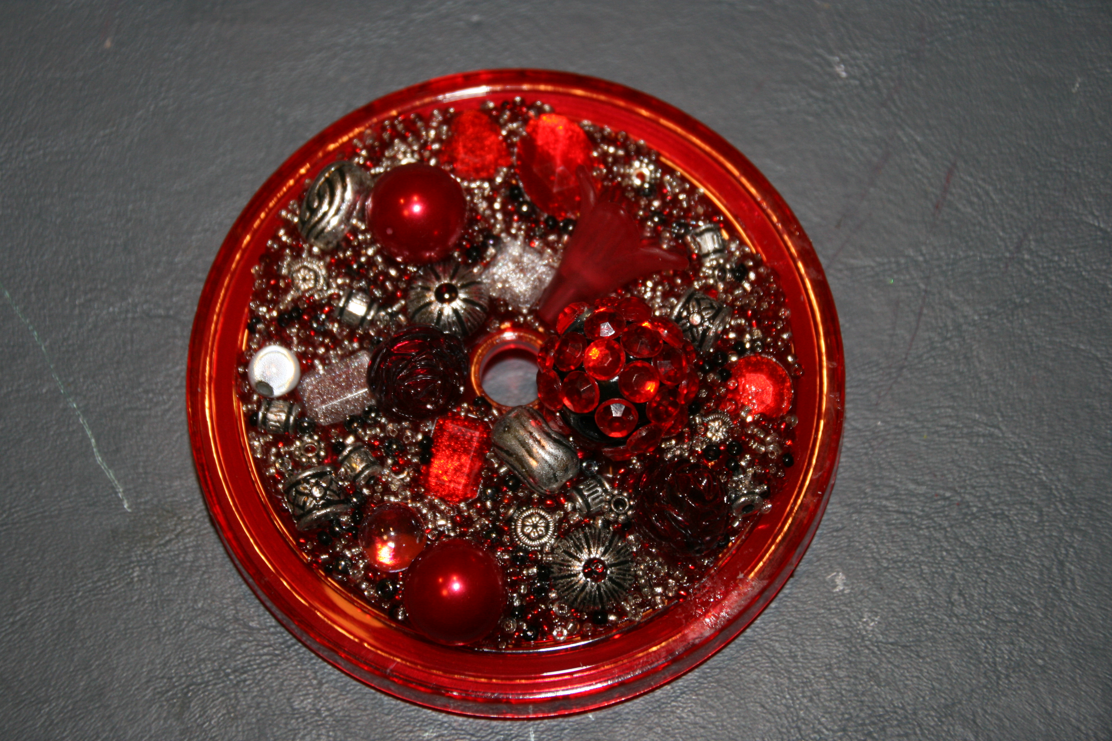 Start by putting some glue on the lid of the cup. Use only enough to cover about 1/3 of the lid. The glue is thick, so use a paint brush to gently spread it around. Be sure to cover the entire area you are working in. Start adhering the beads by placing them in the glue. Use large and medium size beads first. Fill in the spaces with “seed” beads.