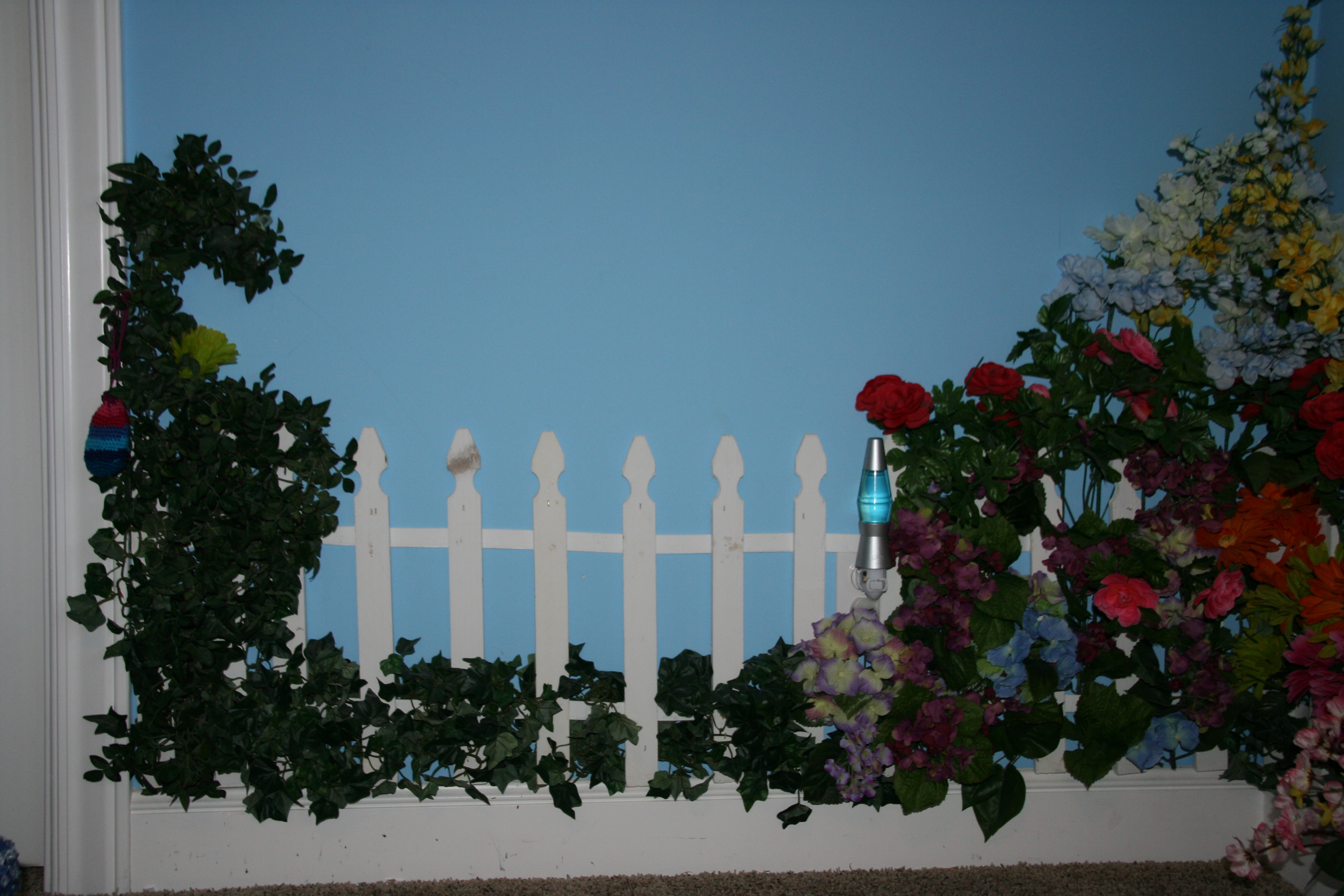 I stapled white picket fence from Home Depot and fake flowers from The Dollar Tree and Walmart to the wall. I used an air compressor & pneumatic nail gun for the stapling. I added green ivy crawling up the trim and across the baseboard.