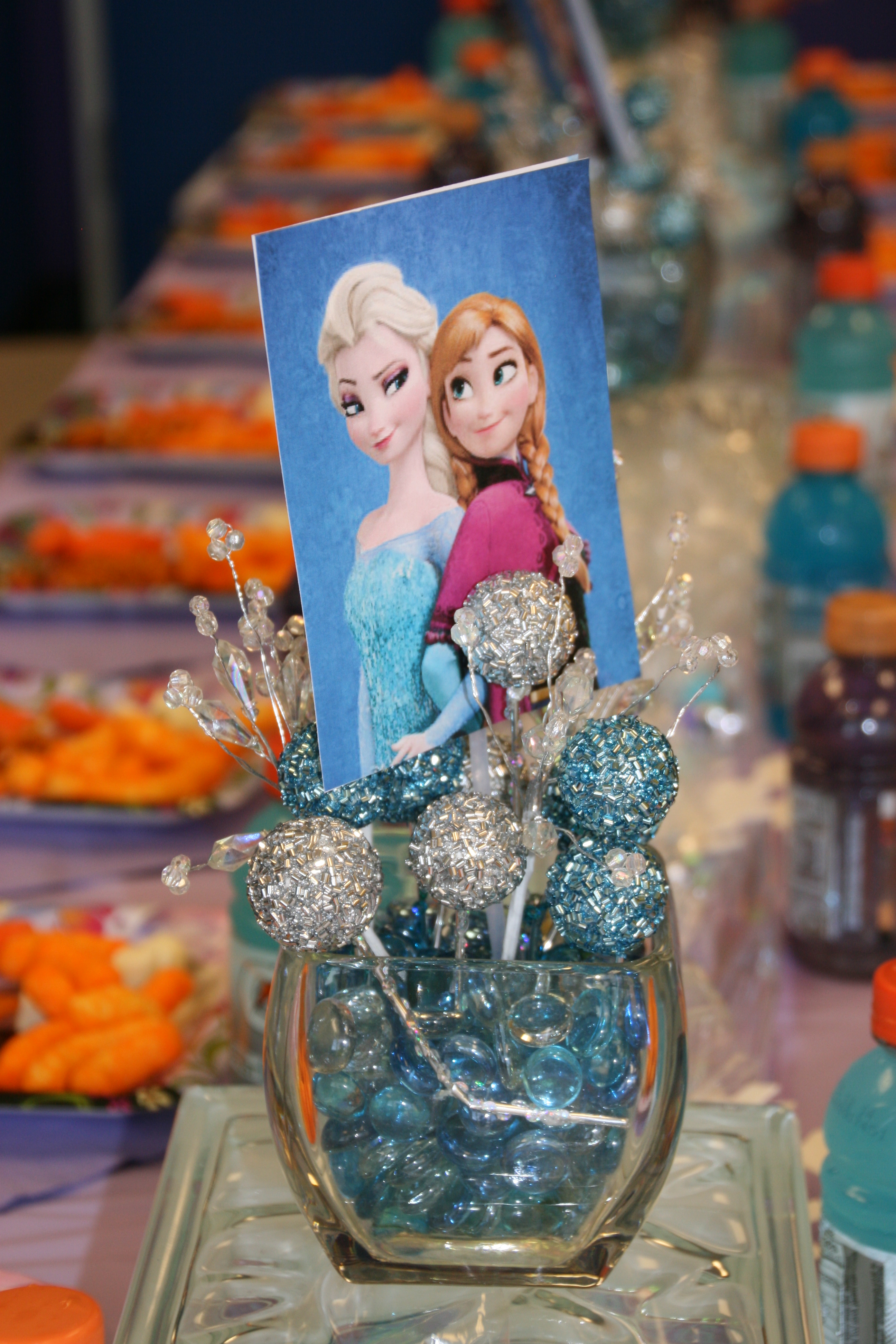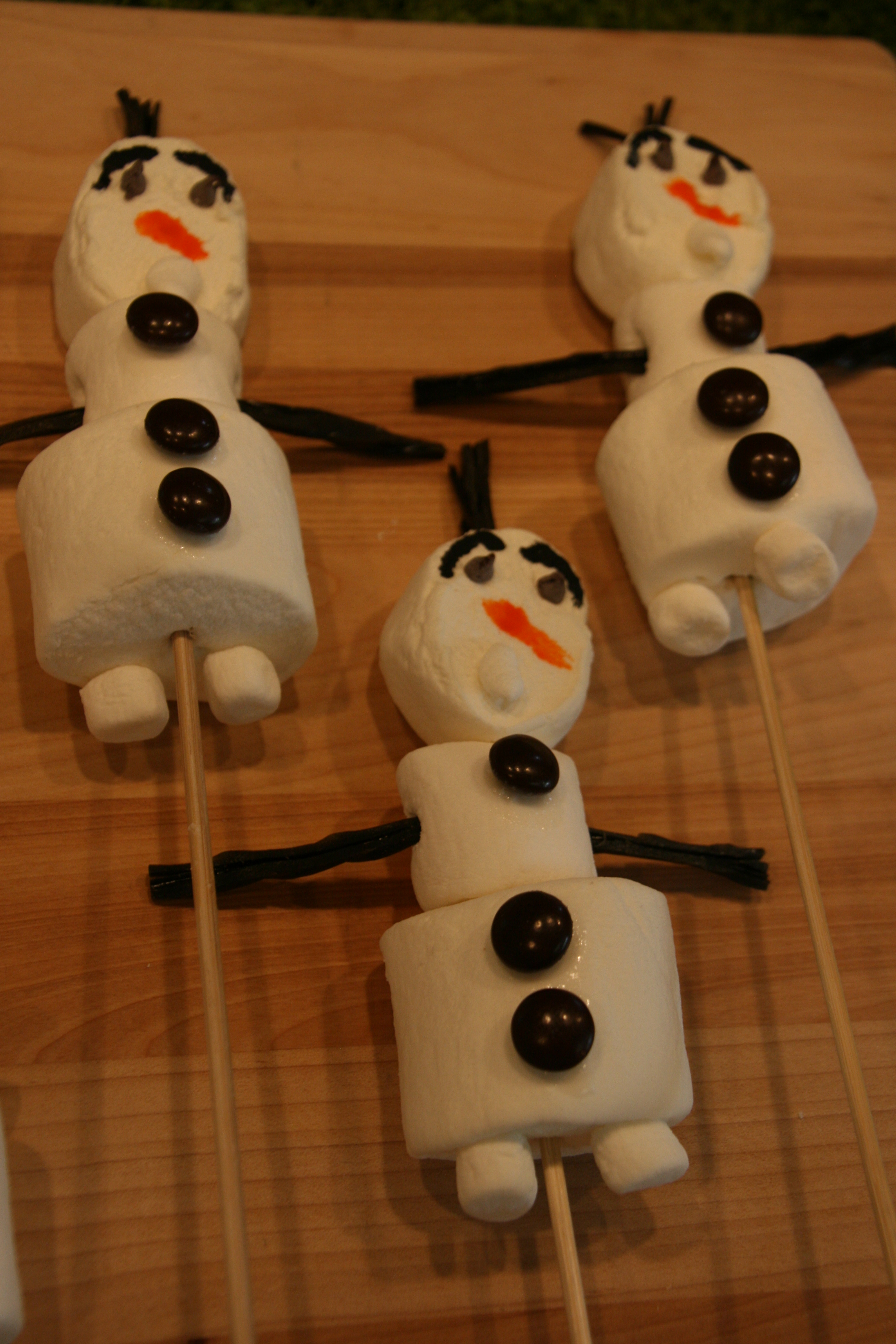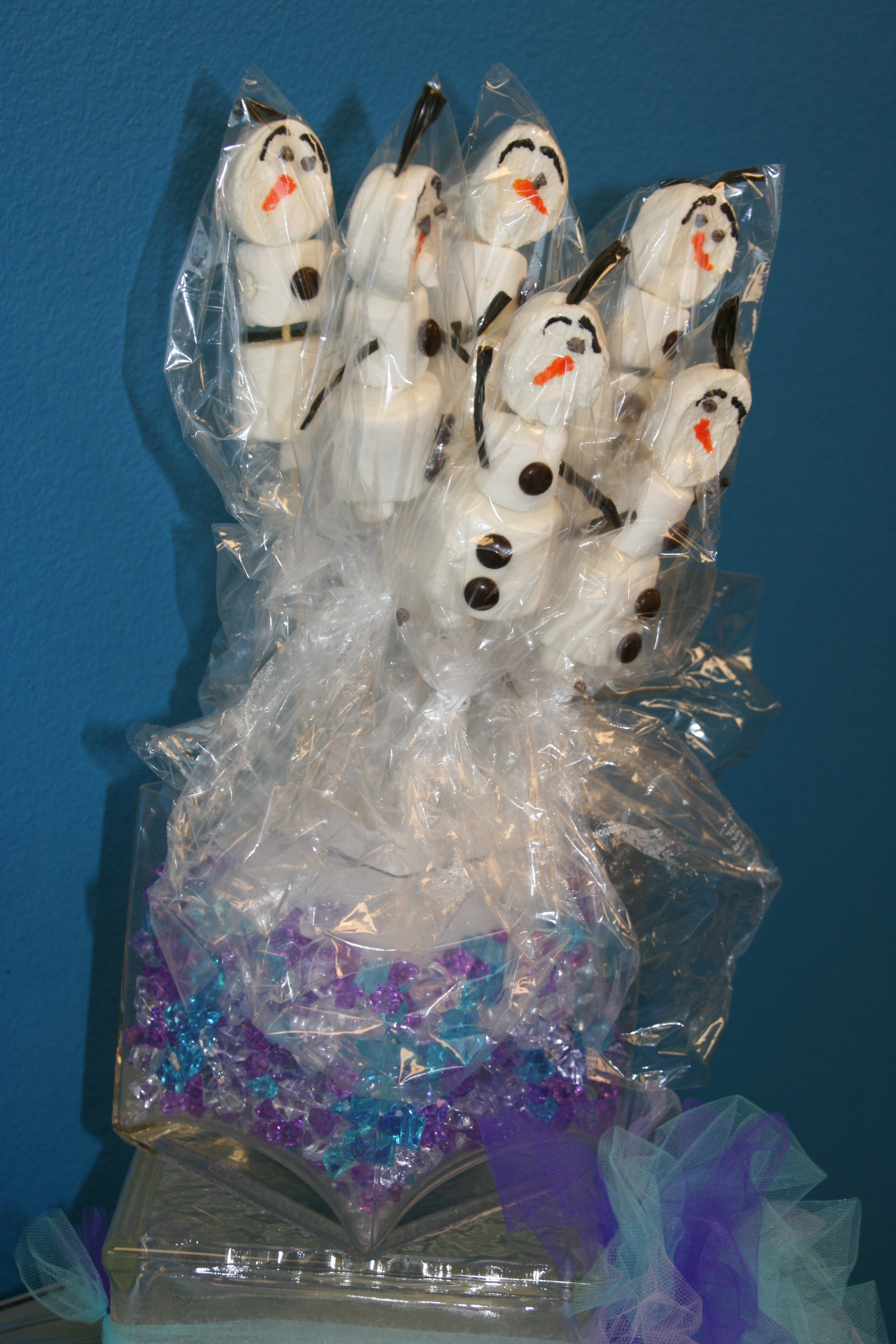 I made “Olaf” snowmen sticks, which I featured in a previous post on this blog. I covered each stick with a clear plastic bag and stuck them in styrofoam cubes & flat pieces for decor. These also were used as part of the party favors.