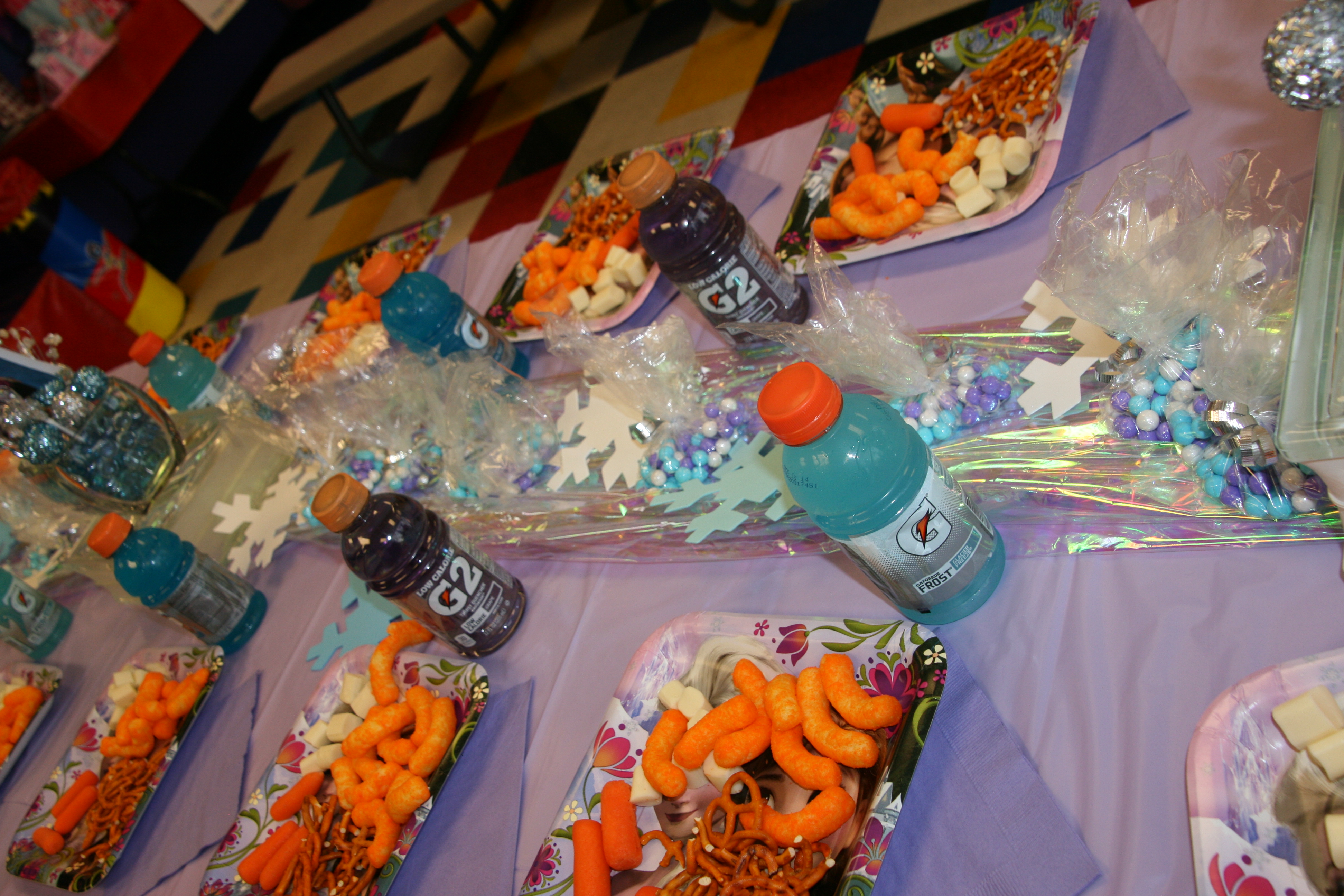 The snacks were carrots, Cheetos, cheese puffs, pretzels, and string cheese cut into cubes. These were indicative of Olaf’s noses, ice blocks, and Sphen”s antlers. The kids drank blue & purple Gatorade.