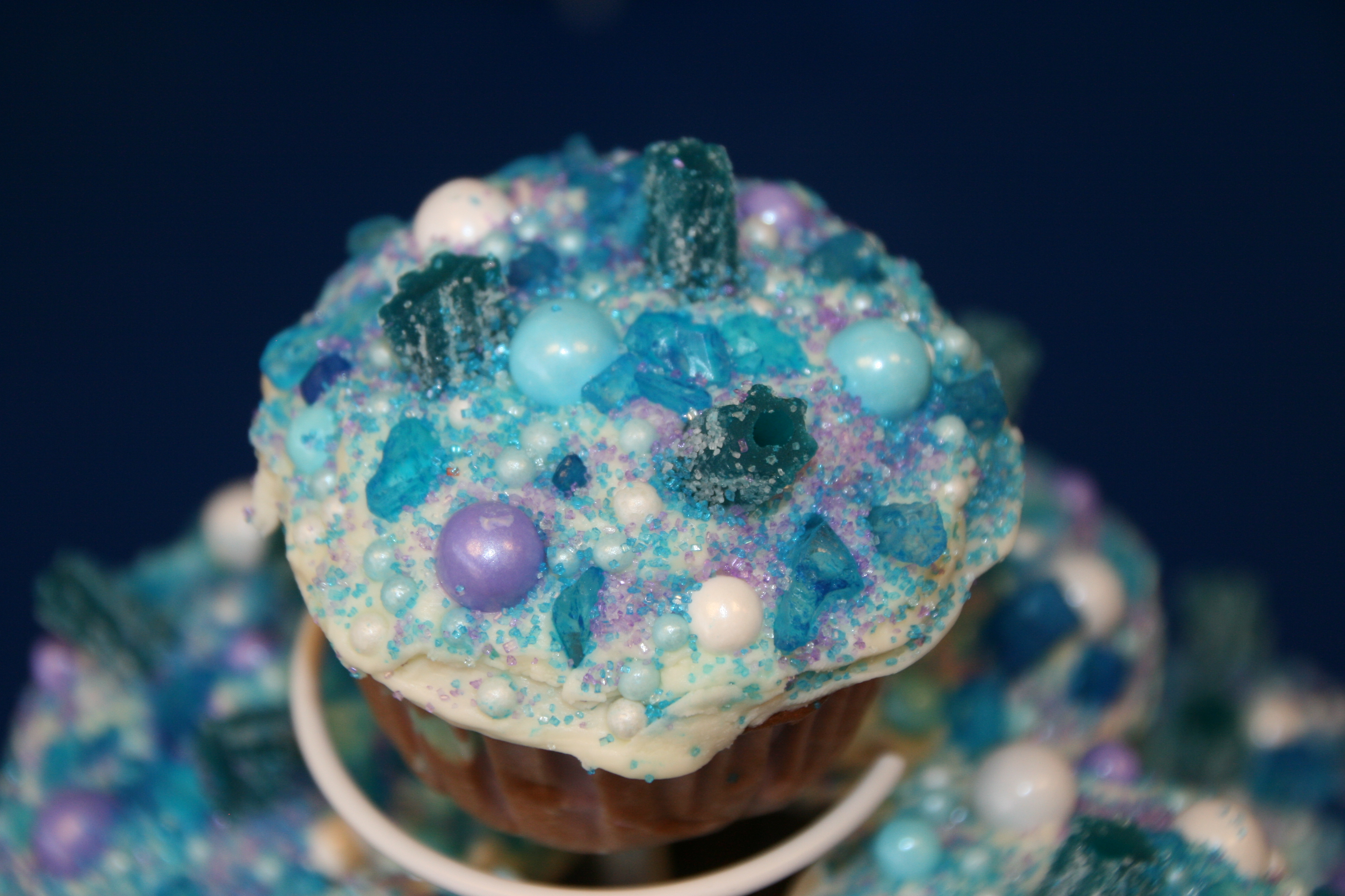 The cupcakes were blue & purple swirl. I mixed food coloring into the cake batter. I topped the cupcakes with vanilla frosting and a variety of candies to make them look like ice. Candies included cut sour blue licorice, Sixlets, small blue & white pearls, rock candy topping, and blue & purple sprinkles.