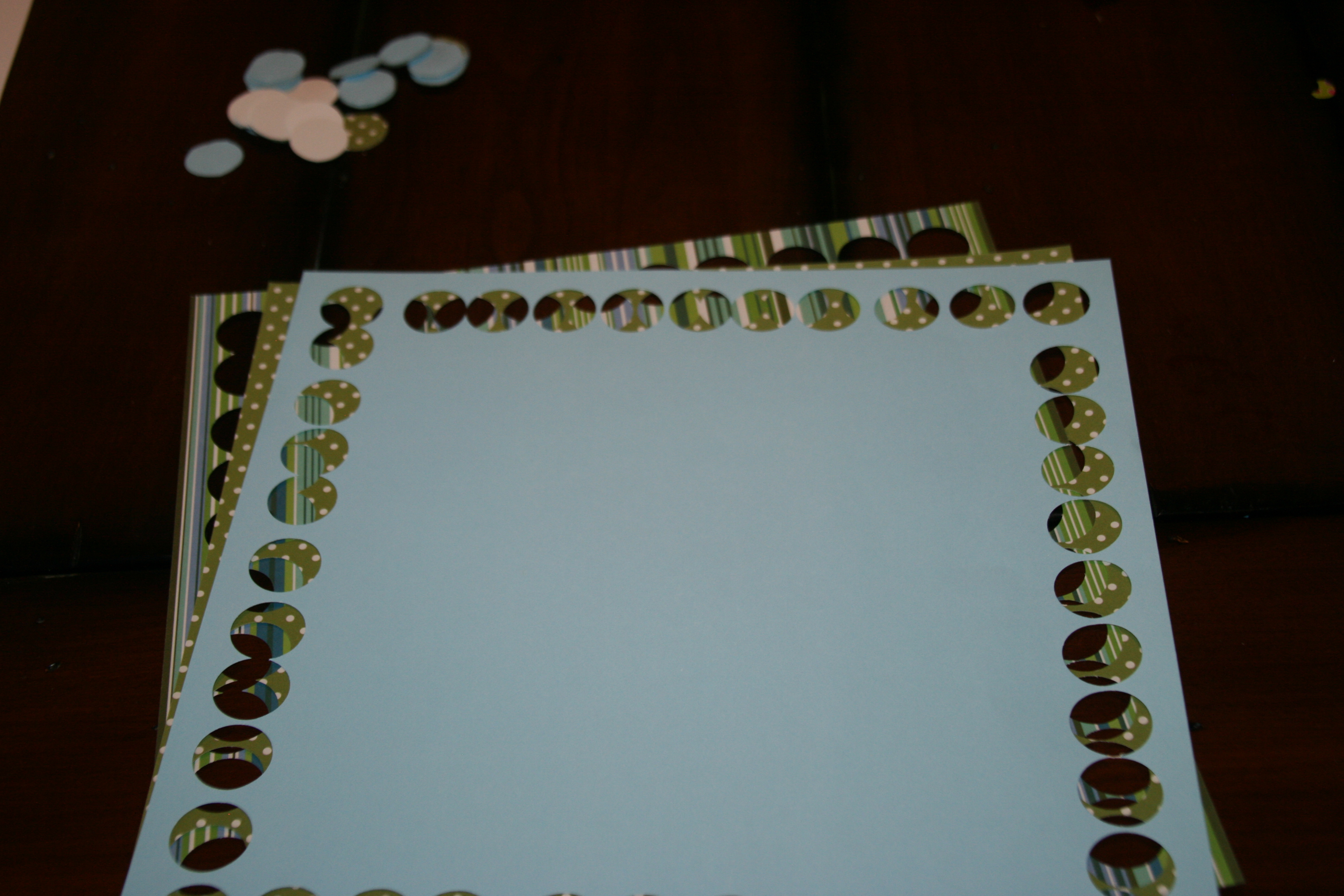 You will need 2 sizes of paper punches, scrapbook paper in coordinating colors, glue stick, white cardstock, and frames. Start by punching both sizes of holes in the scrapbook paper.