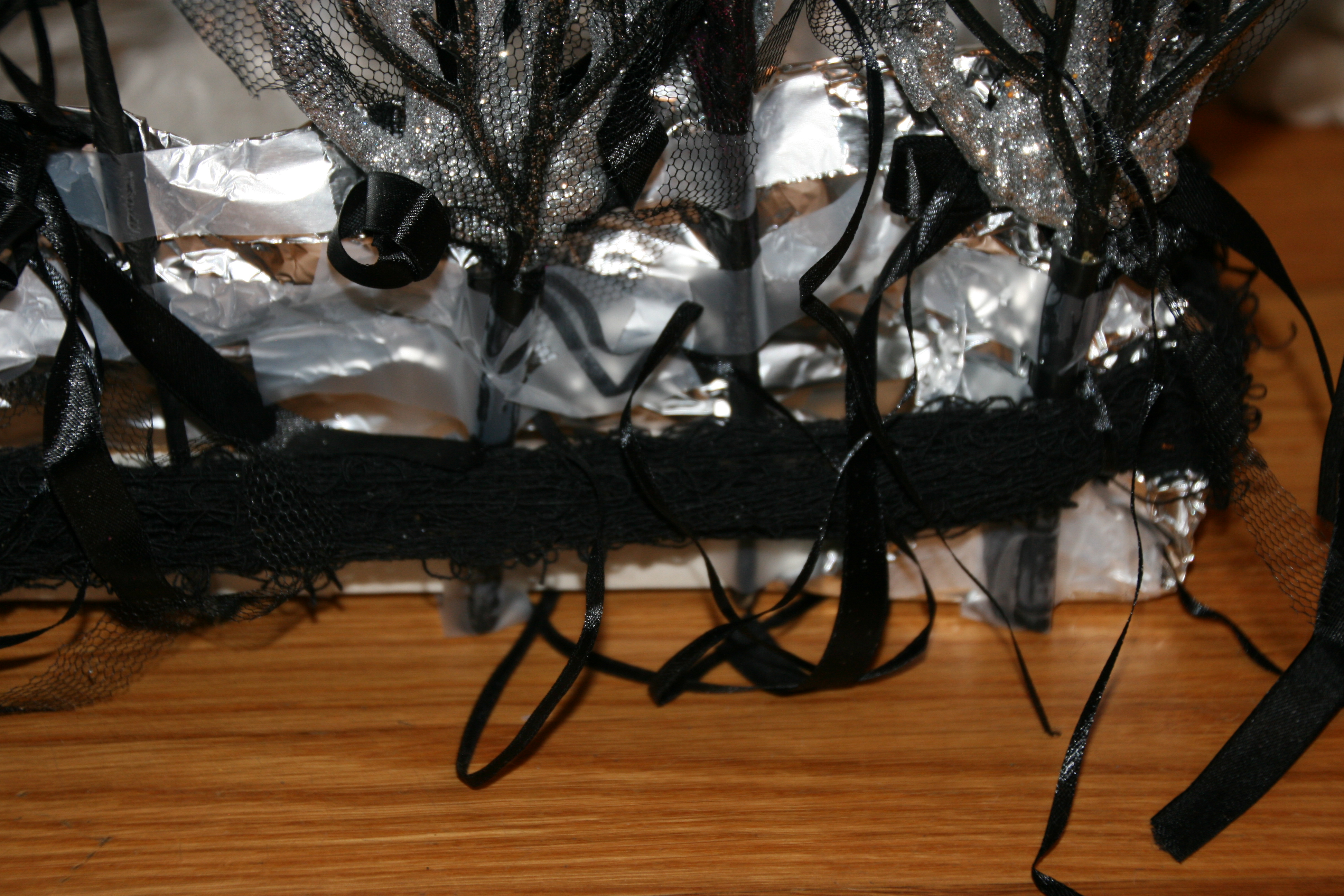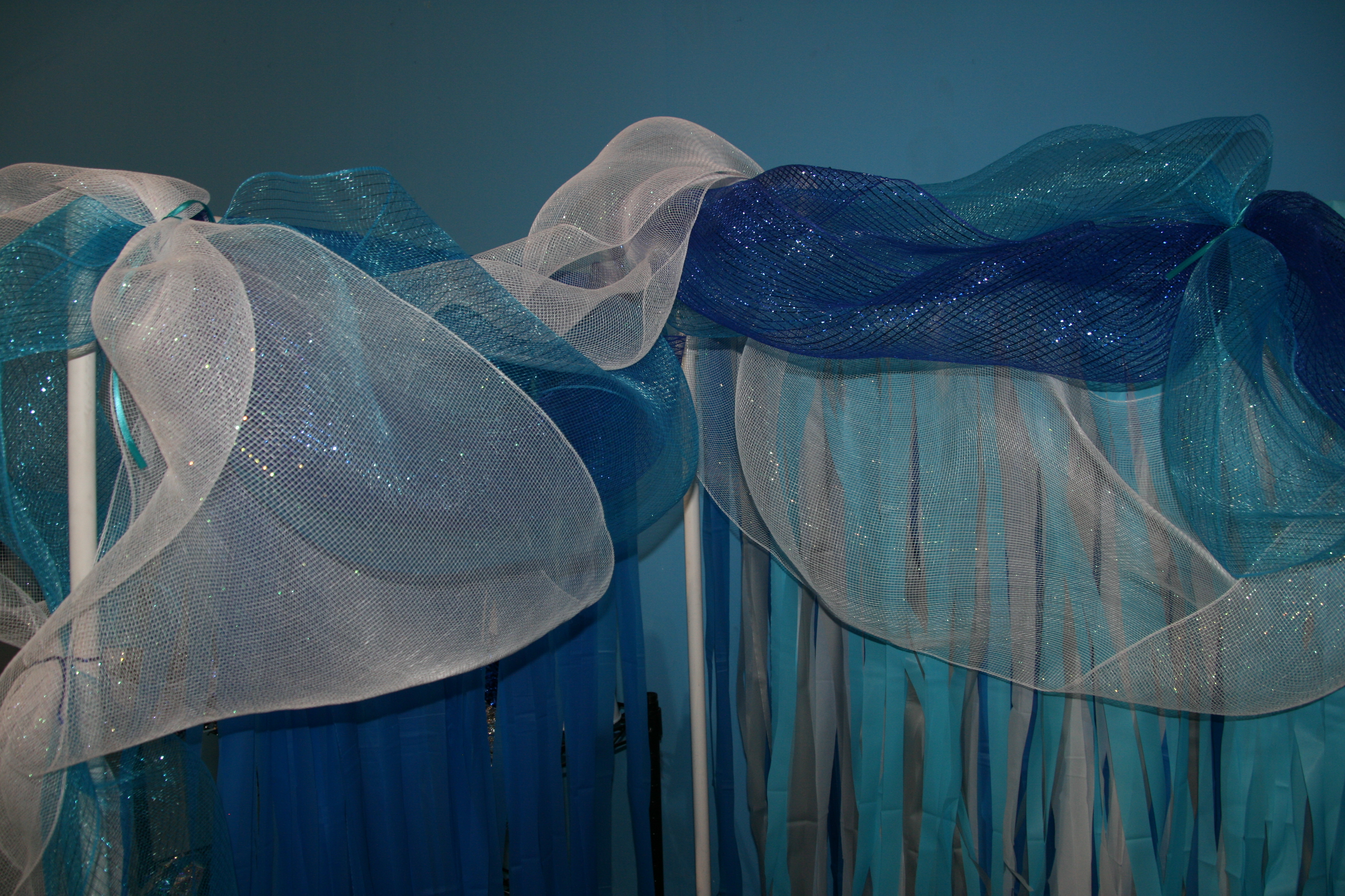 I staggered the length and colors of the table cloths on the frame to create interest. Then I used mesh, that comes on a roll, to hide the pvc pipe in front, and to add dimension to the top of the booth. I purchased silly masks, glasses, pom poms, megaphones, & ribbon twirlers as accessories for the girls to wear in the pictures.