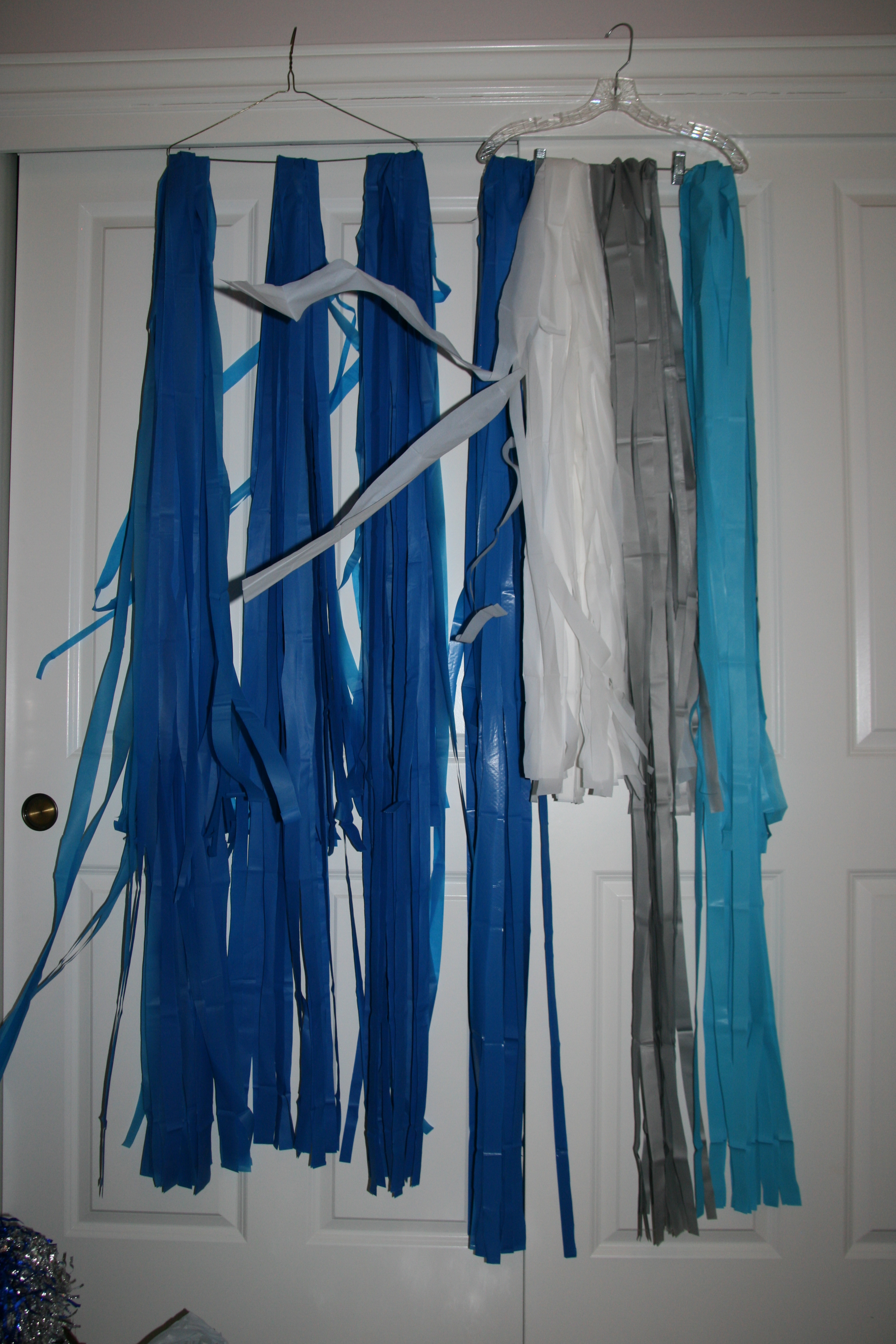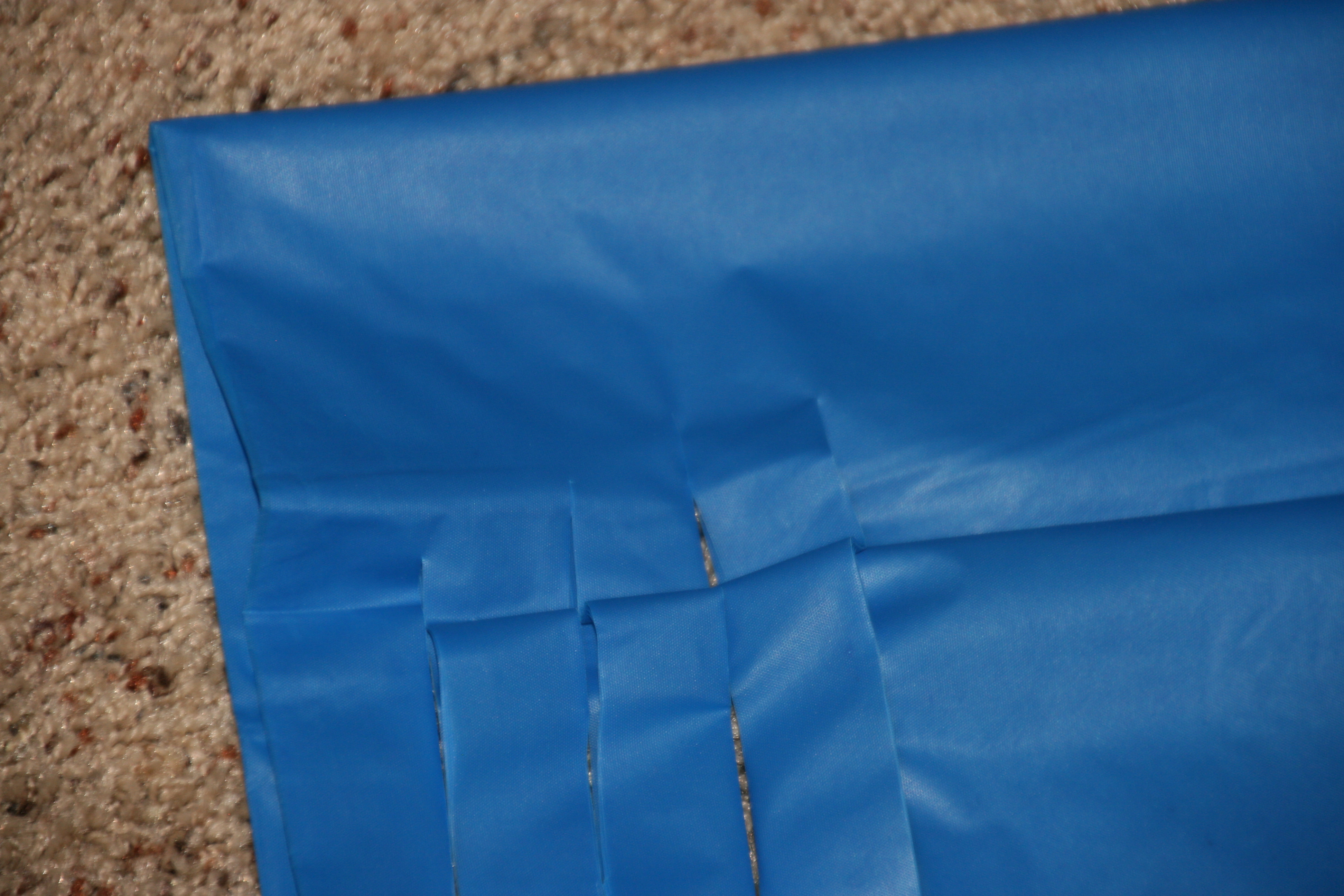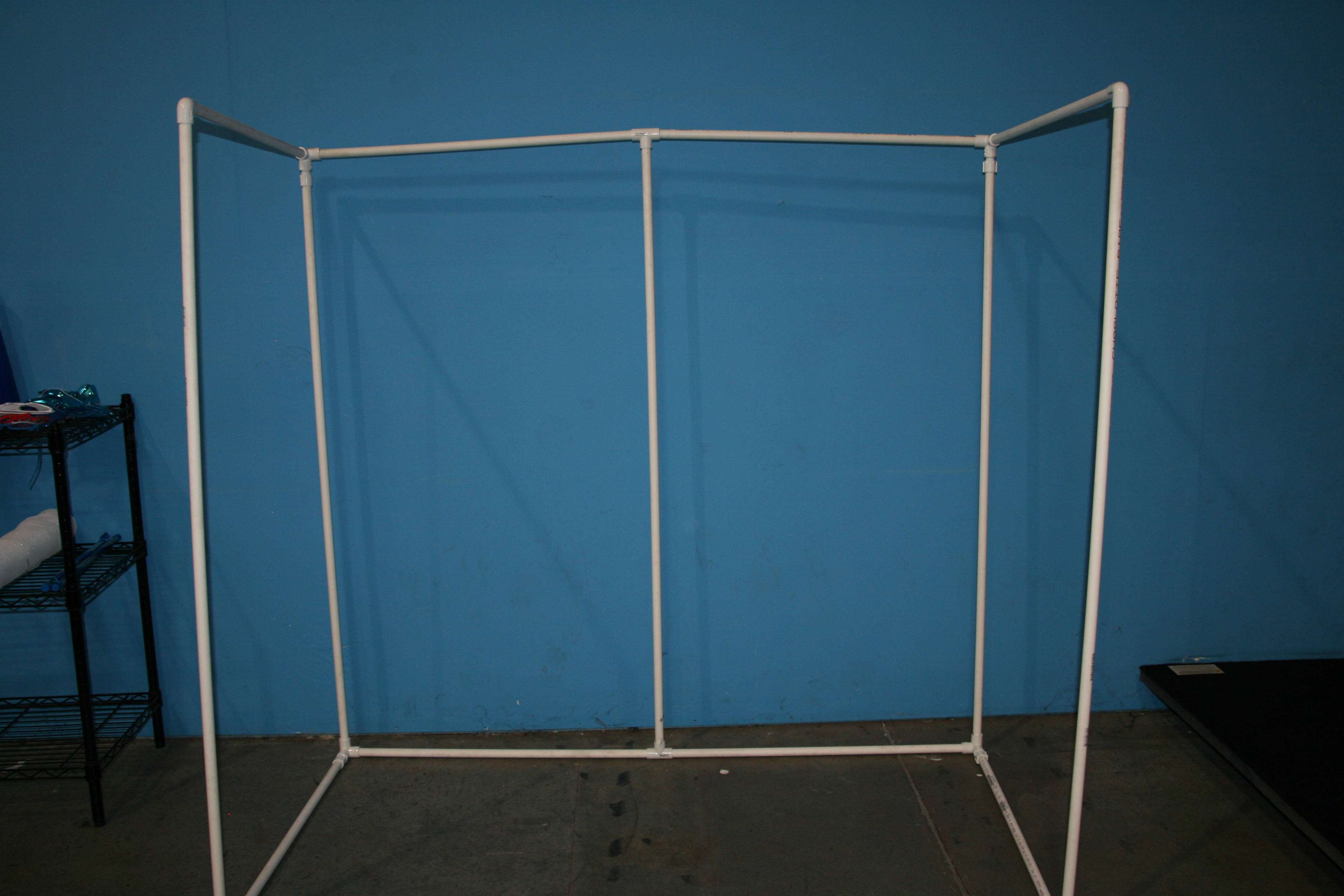 I cut plastic rectangle table cloths into strips, leaving a folded area at the top. This folded area is where I draped the table cloth over the pvc pipe frame.