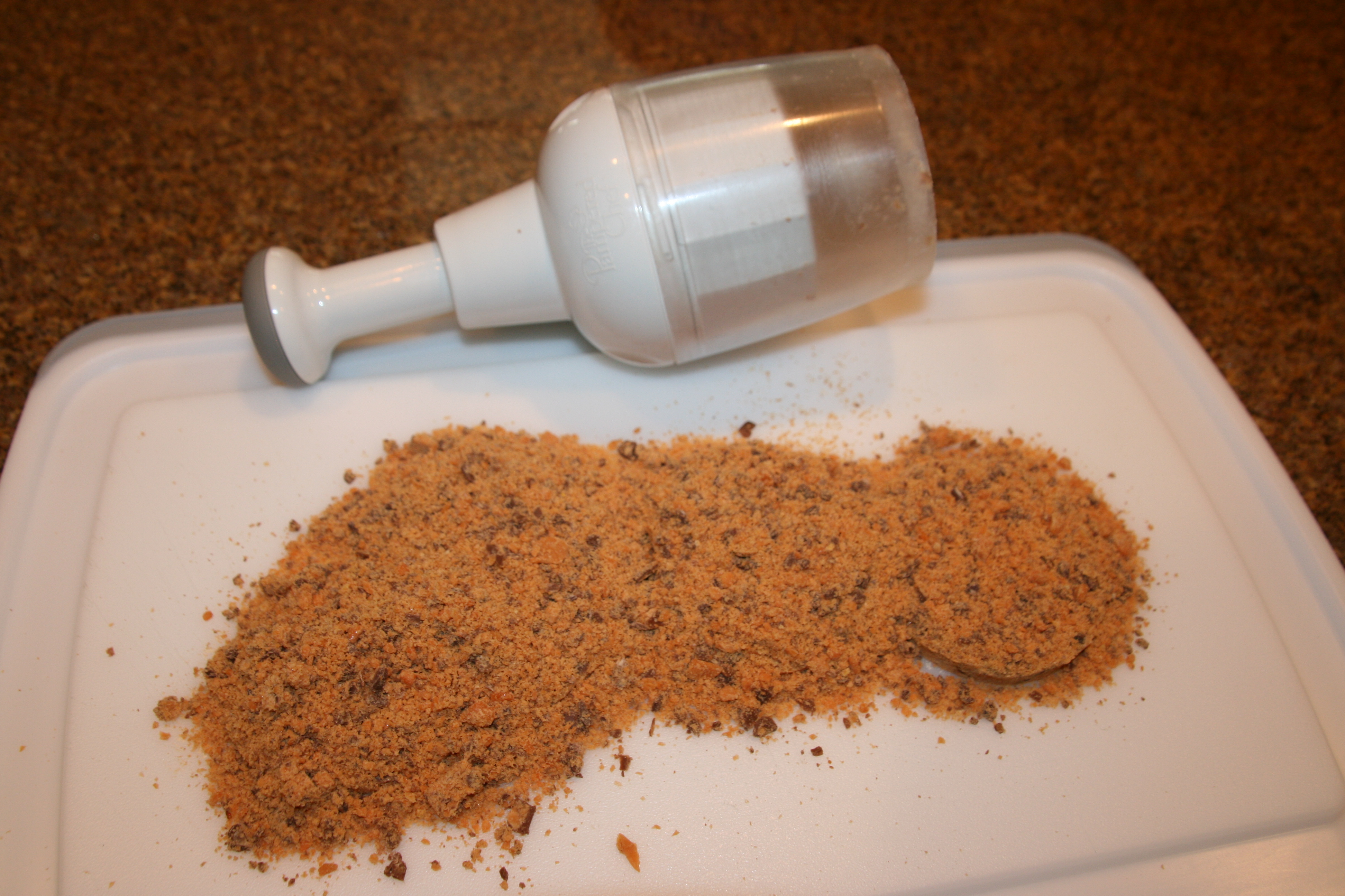 Start by mixing a box of brownie mix as the instructions state. Put the brownie mix in your pan. Crush 2 large Butterfinger candy bars until they are powder. I use my Pampered Chef chopper for this task and it works great!