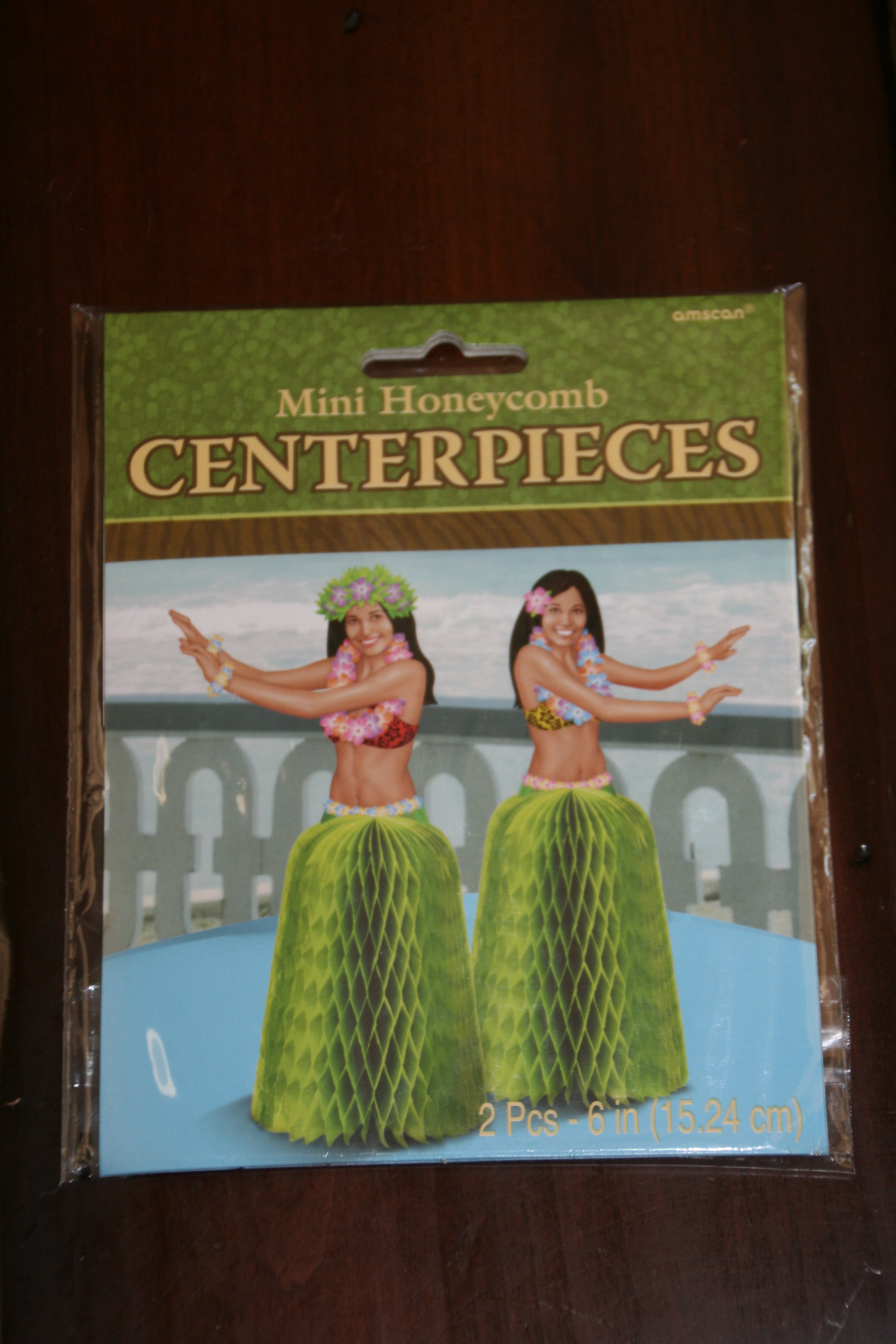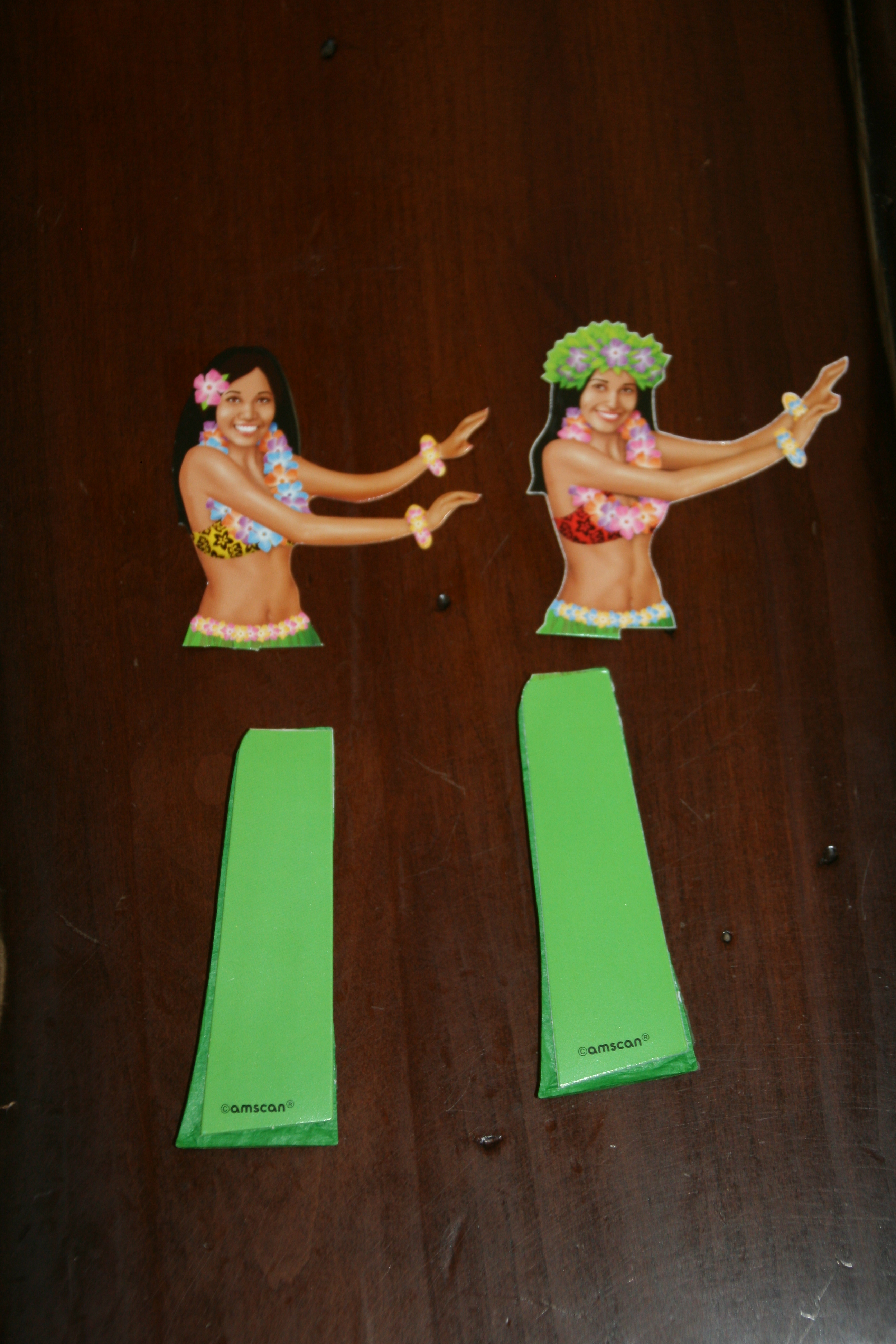 I wanted to create fun invitations. I bought these Hula Girl centerpieces at Party City and cut off the skirt.