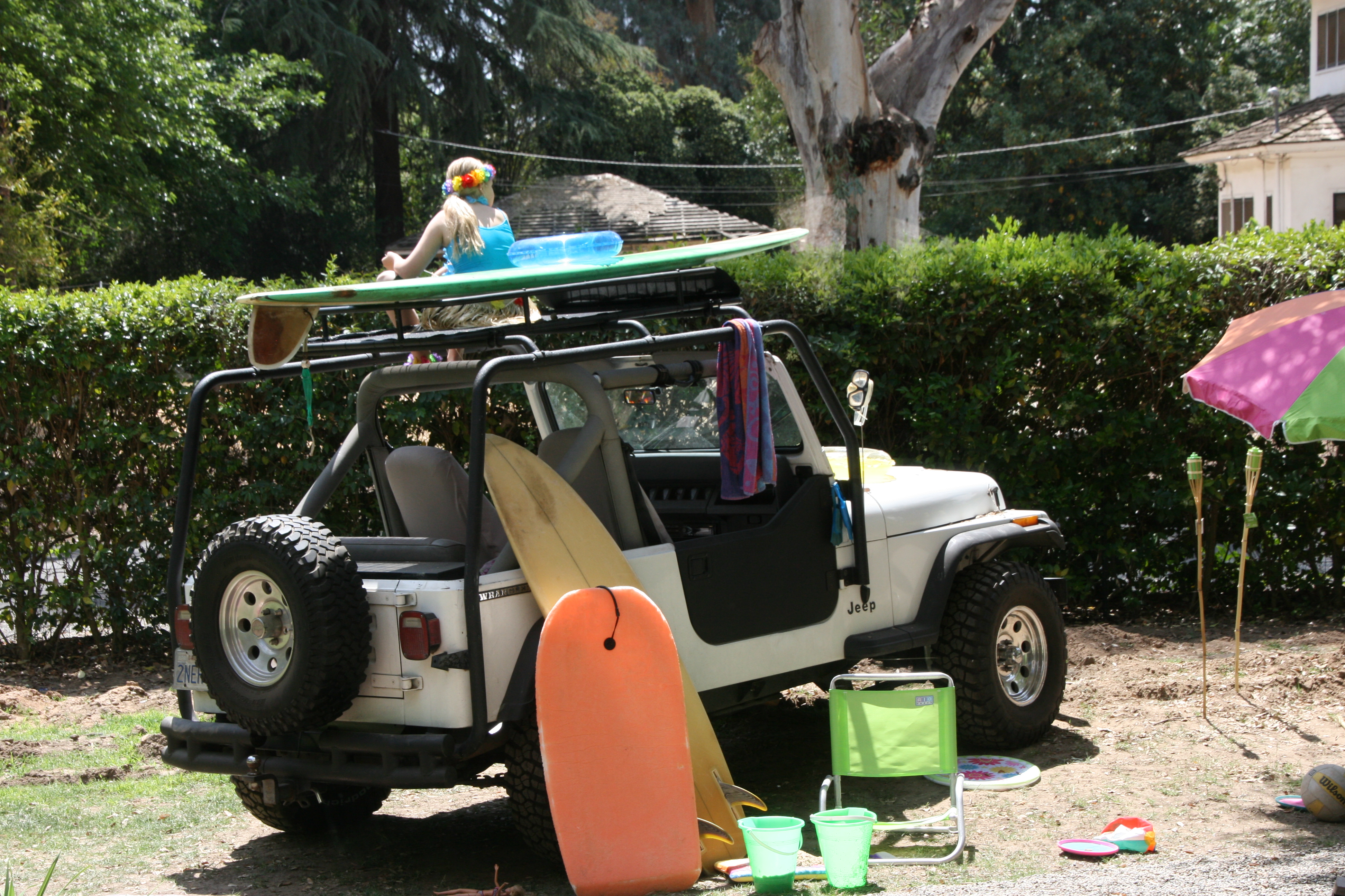 When I host a party, I GO BIG!!! I have a ridiculous amount of fun planning and decorating for a party. It is like a drug for me!!! My husband gets into the fun also. For our daughters LUAU birthday party, he parked his jeep in our front yard and decorated it with surf boards, boogie board, beach chairs, buckets, umbrella, tiki torches, and more. This is the first thing that the guests saw as they arrived to the party. Talk about a grand entrance!!!