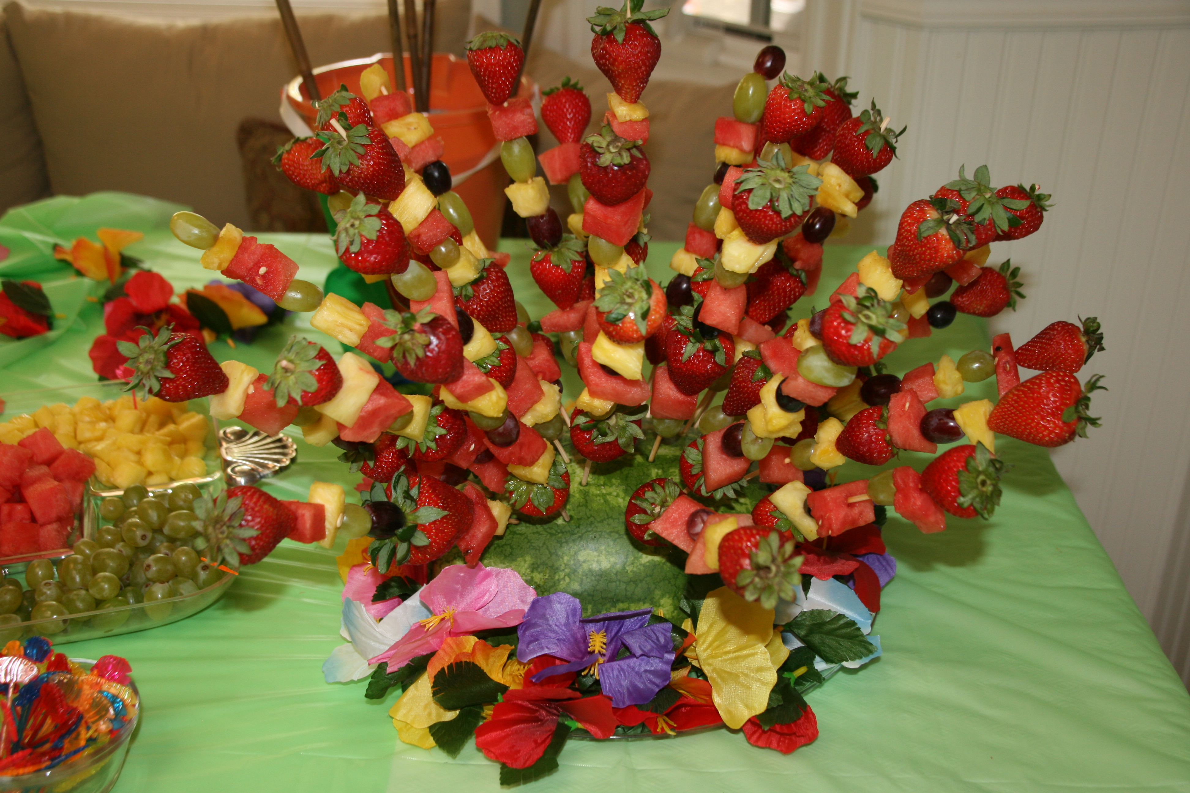 To keep with the theme, we had Hawaiian King rolls with lunchmeat and cheese. I made fruit skewers and stuck them into half of a watermelon. I made smoothies for the kids and my husband made blue Hawaiian drinks for the adults.
