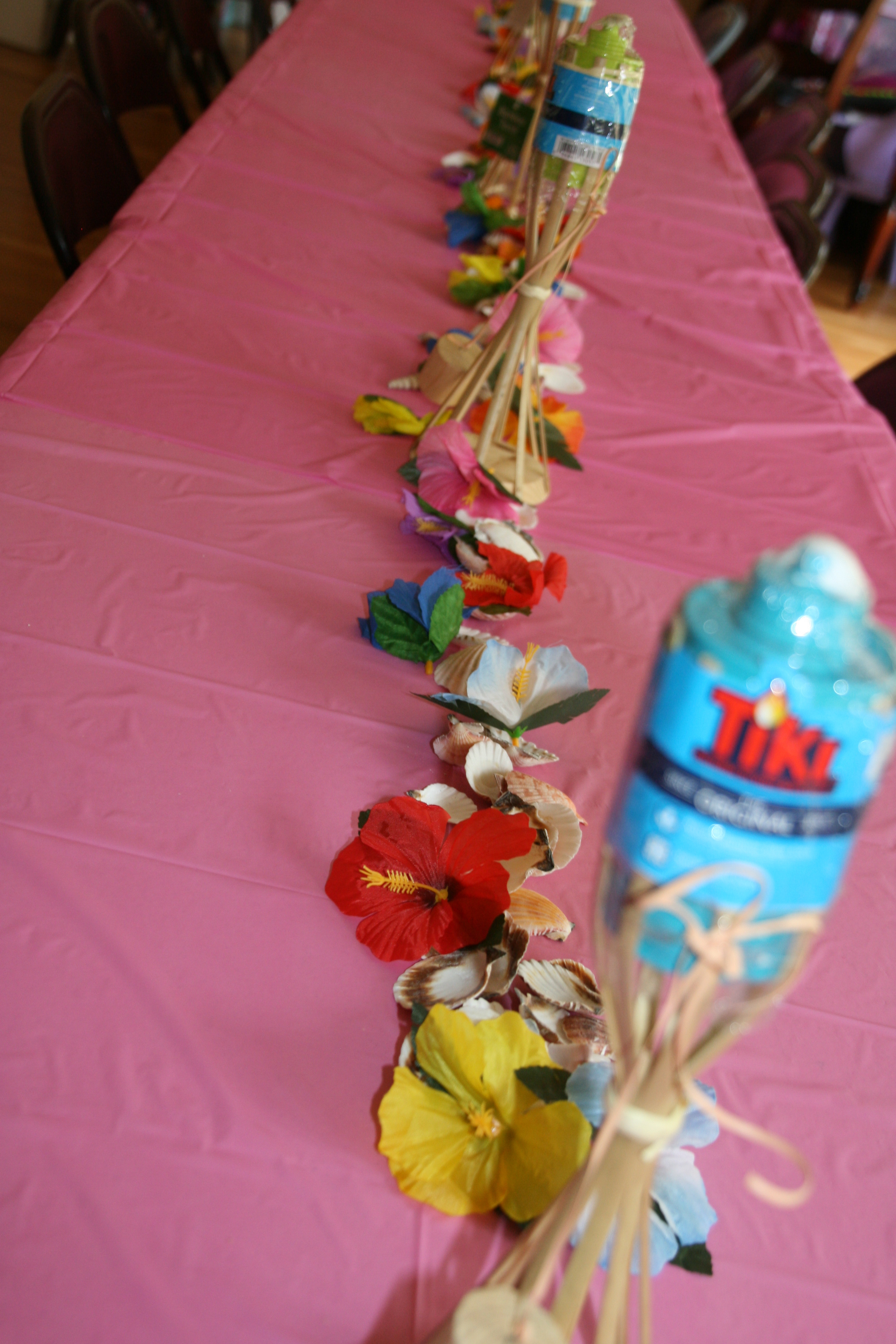 On the table, I scattered hibiscus flowers and shells. I also added table top tiki torches.