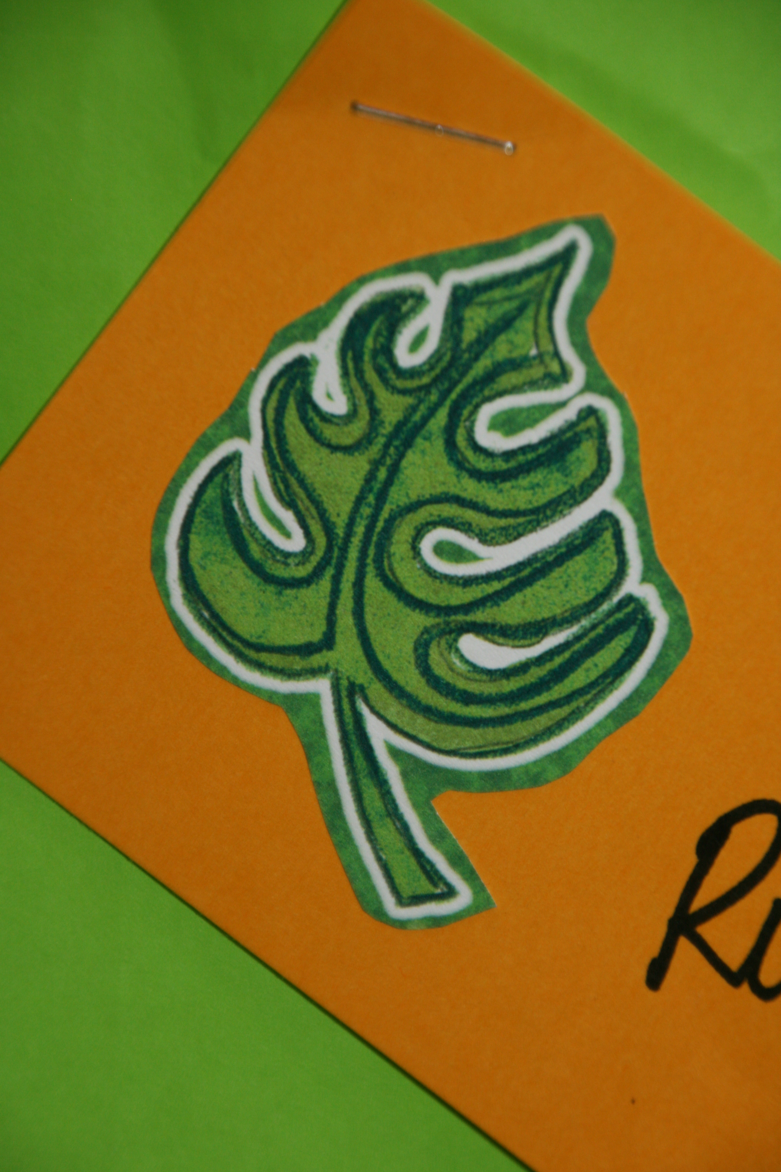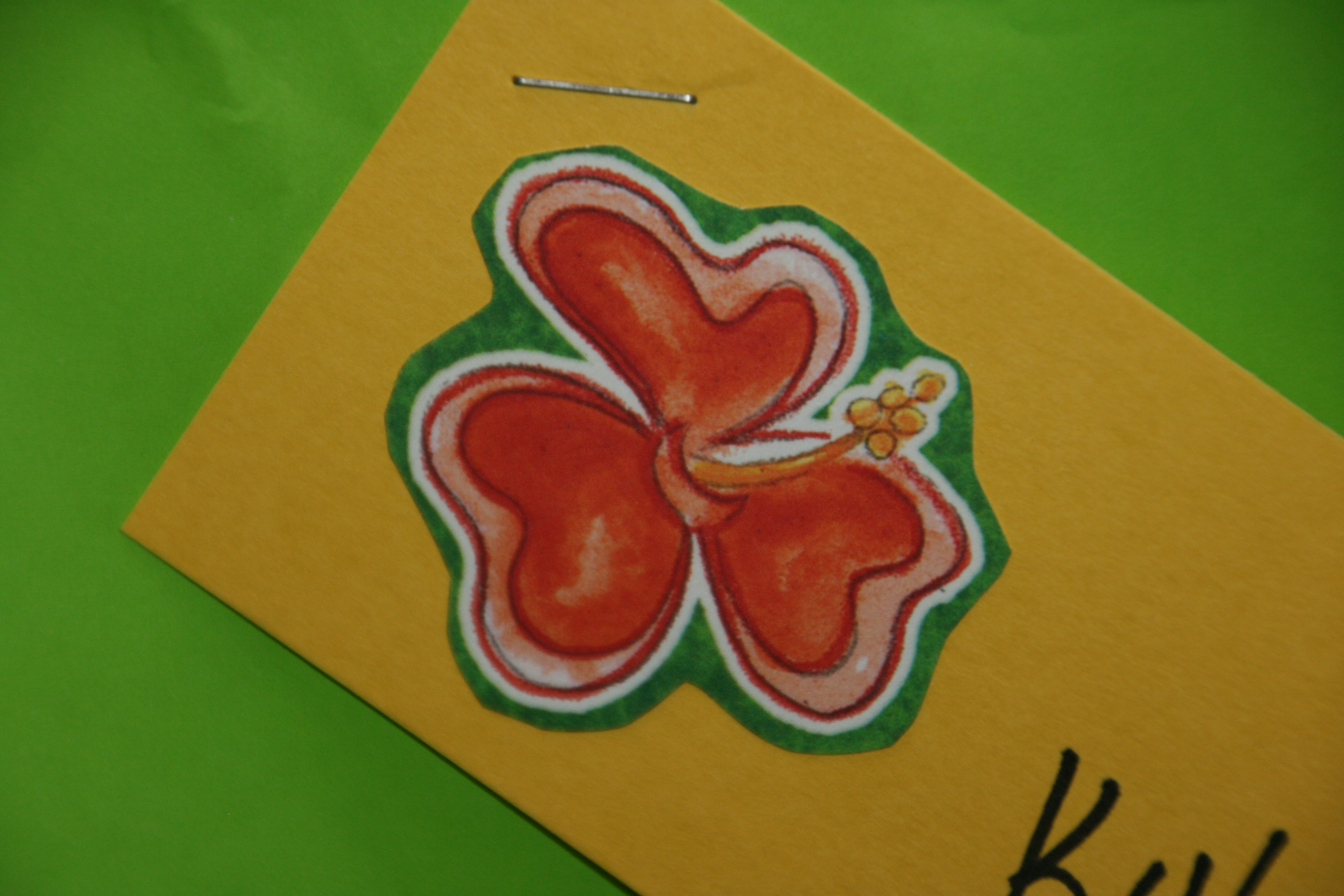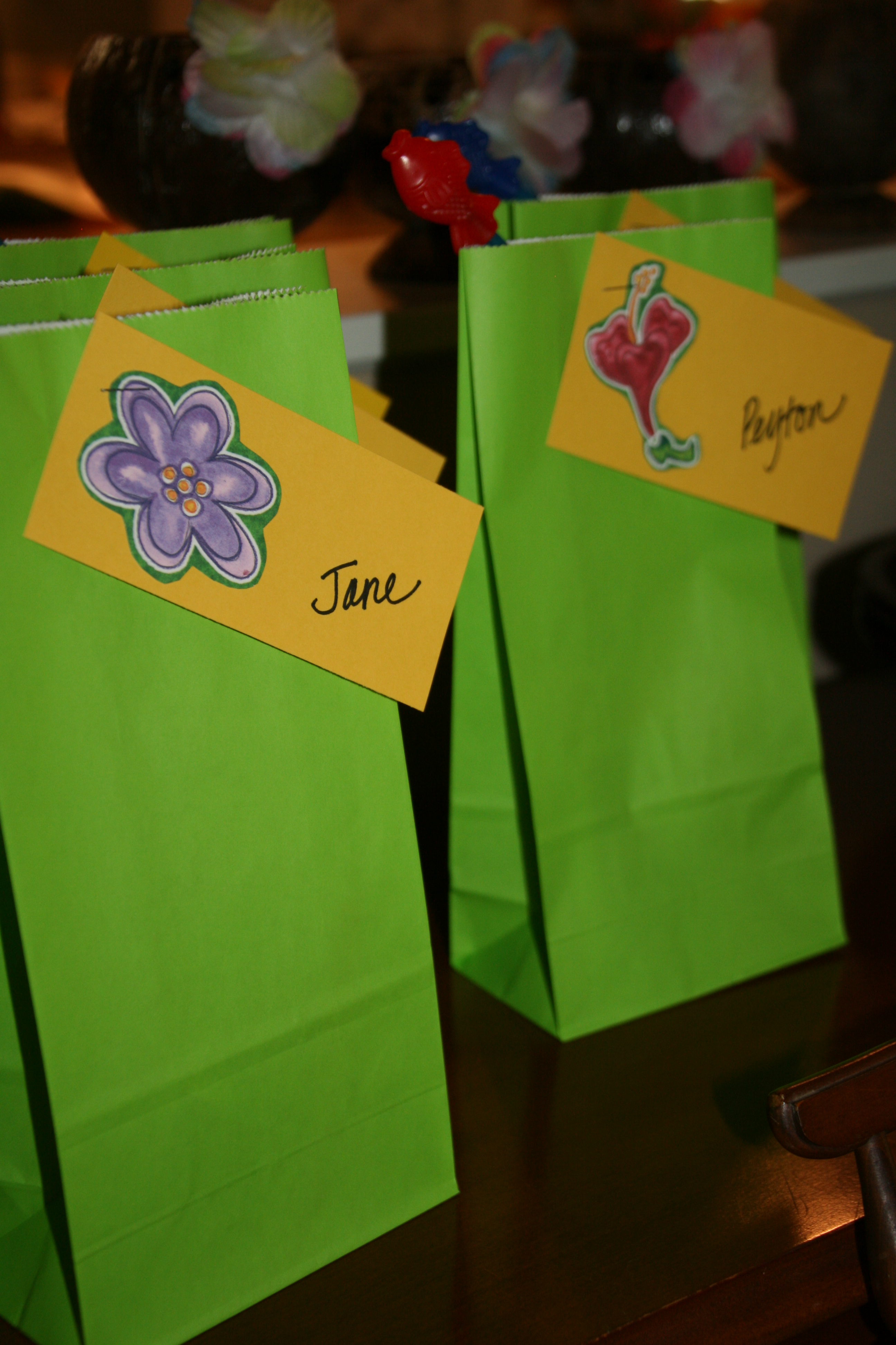 As the guests departed, they received a goody bag filled with treats, including a gift card to Jamba Juice and a fish straw. I created name tags by cutting out hibiscus flowers from scrapbook paper and glued them onto yellow tags. I then stapled the tags to the bags. Very festive!