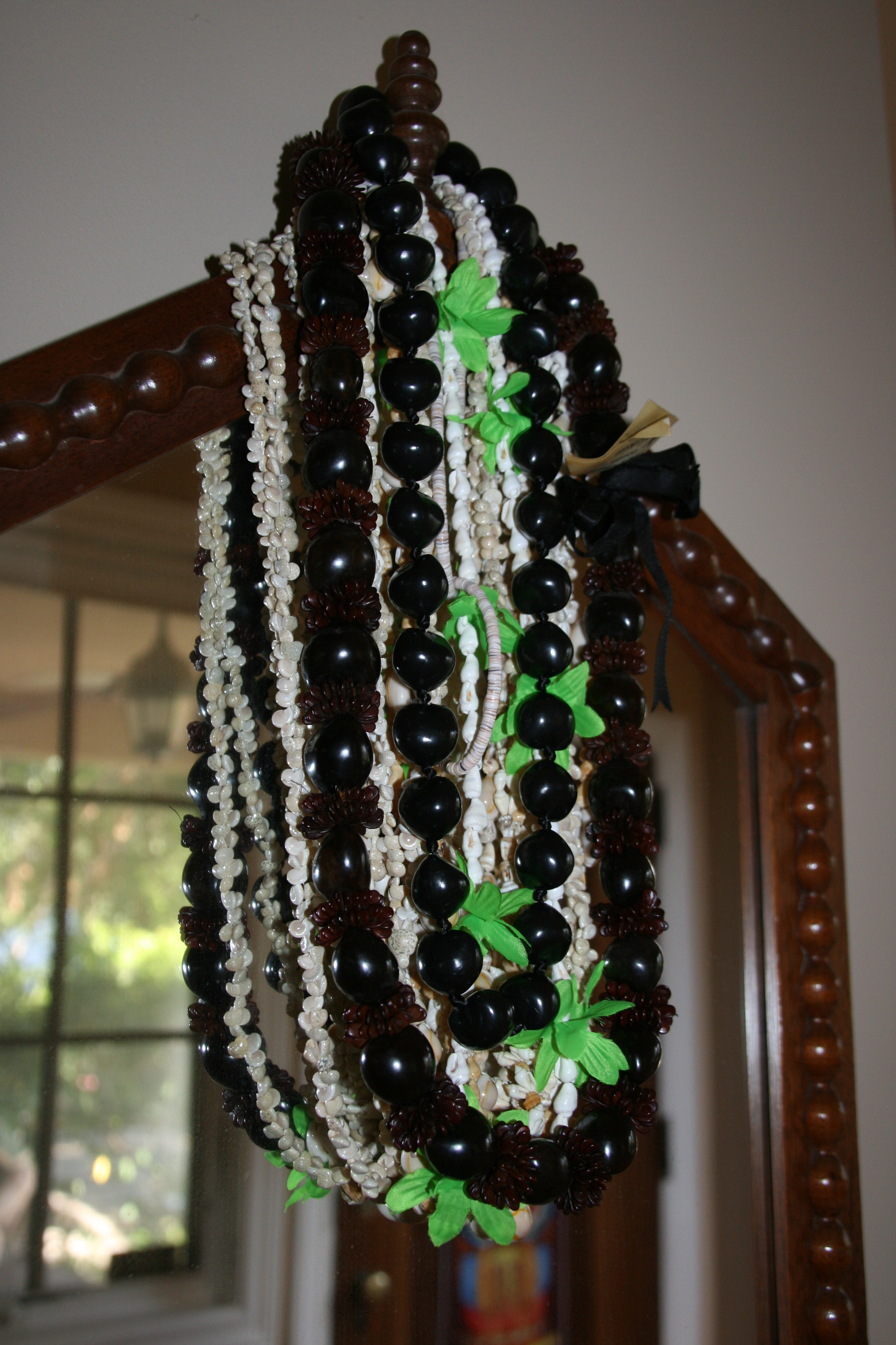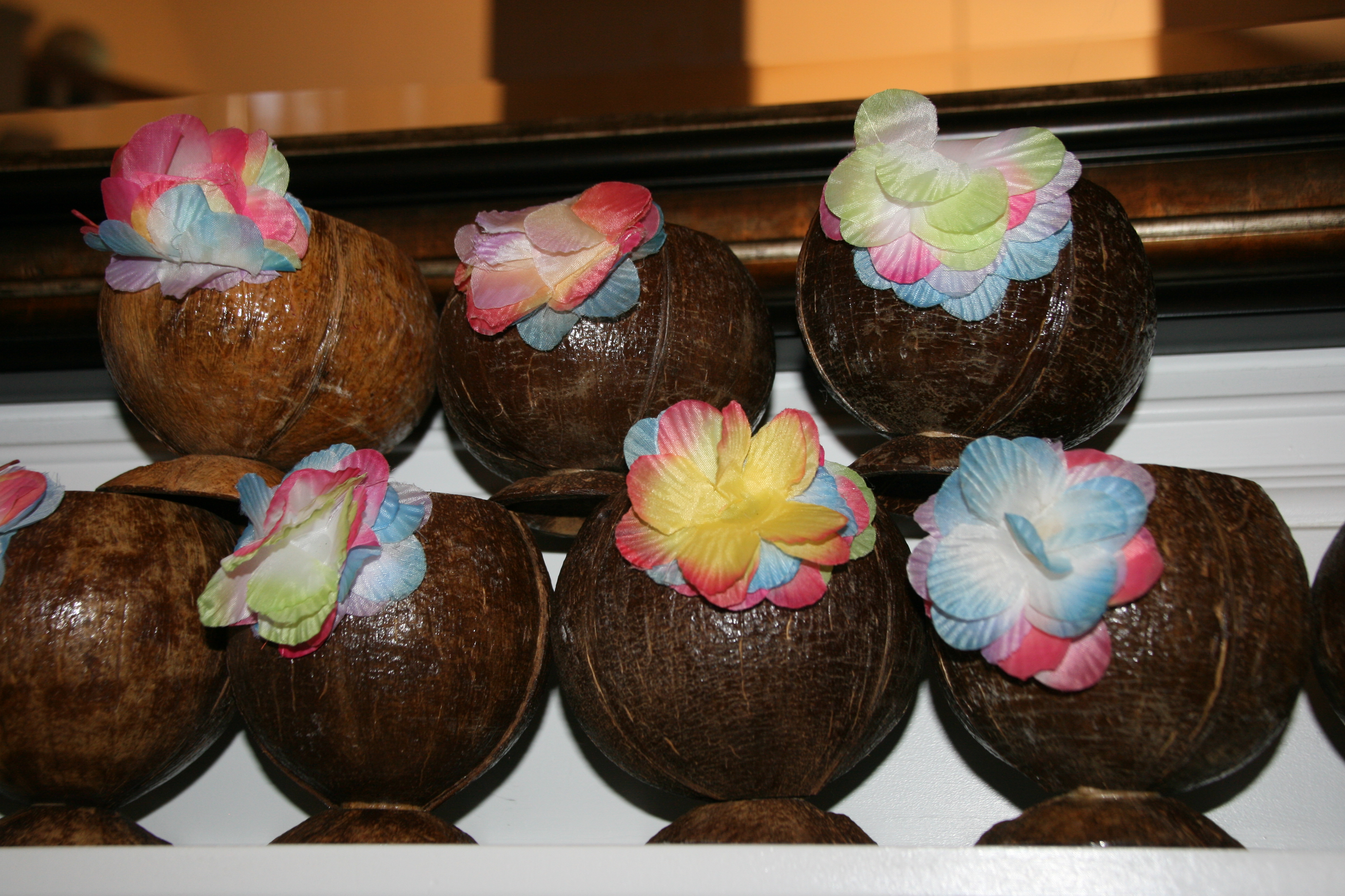 I stacked coconut cups on the mantle and hung beads from a mirror for added decor.