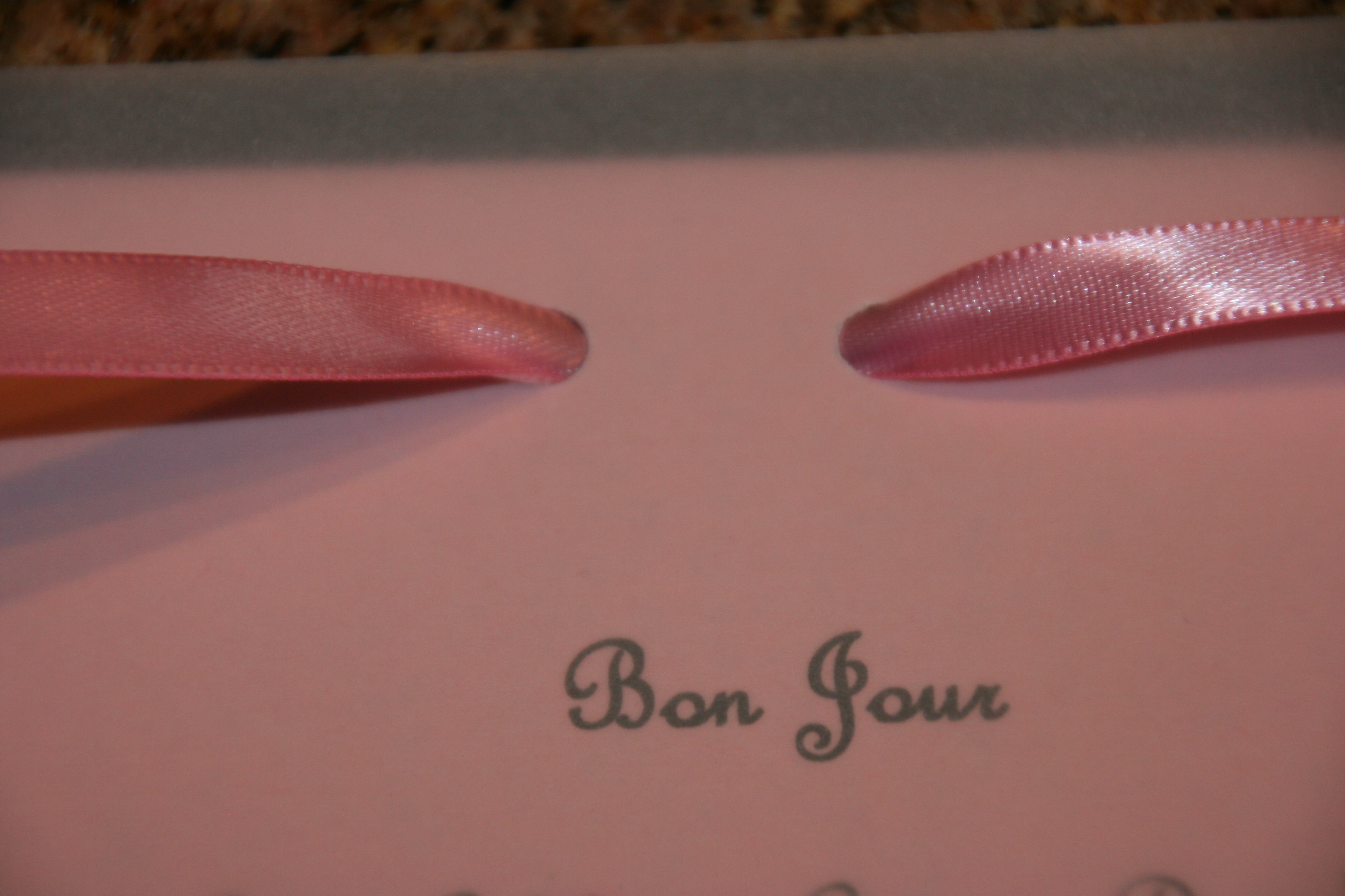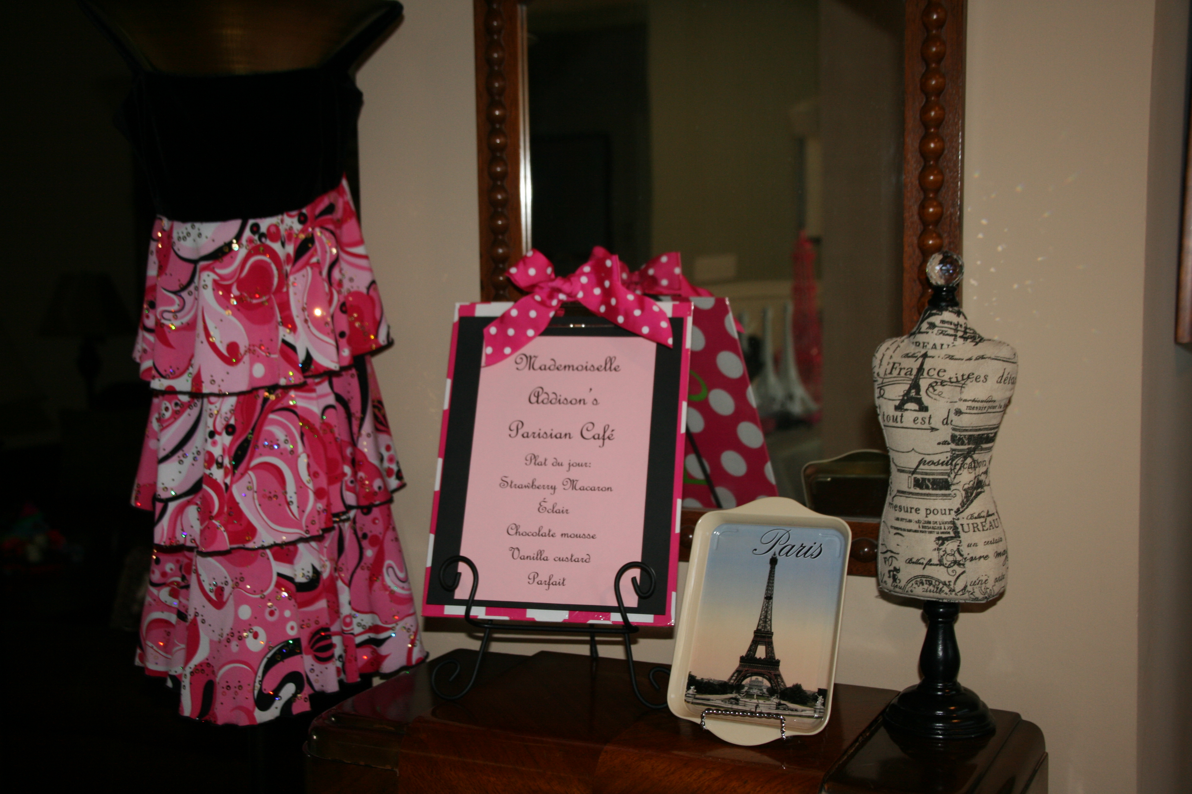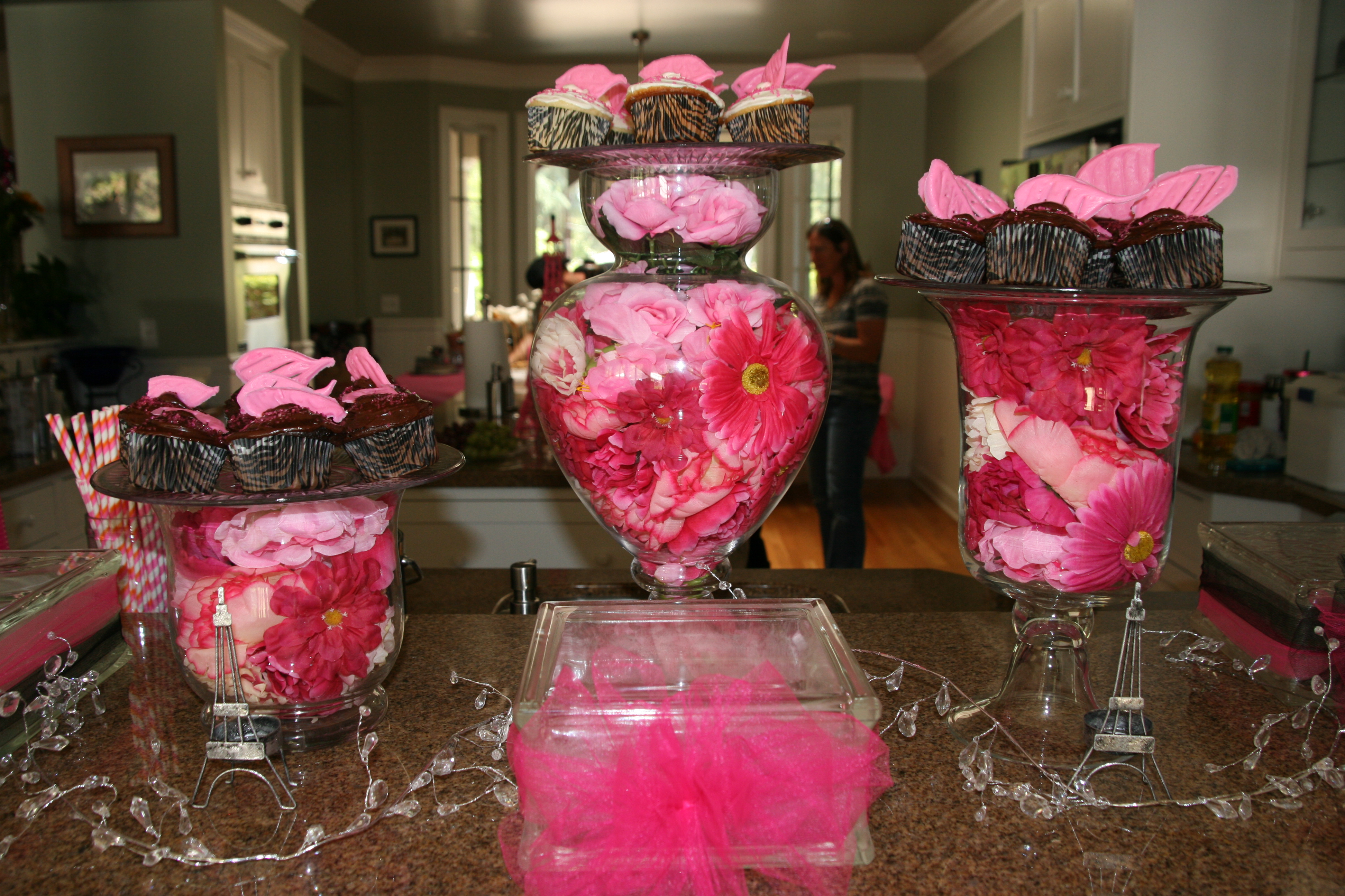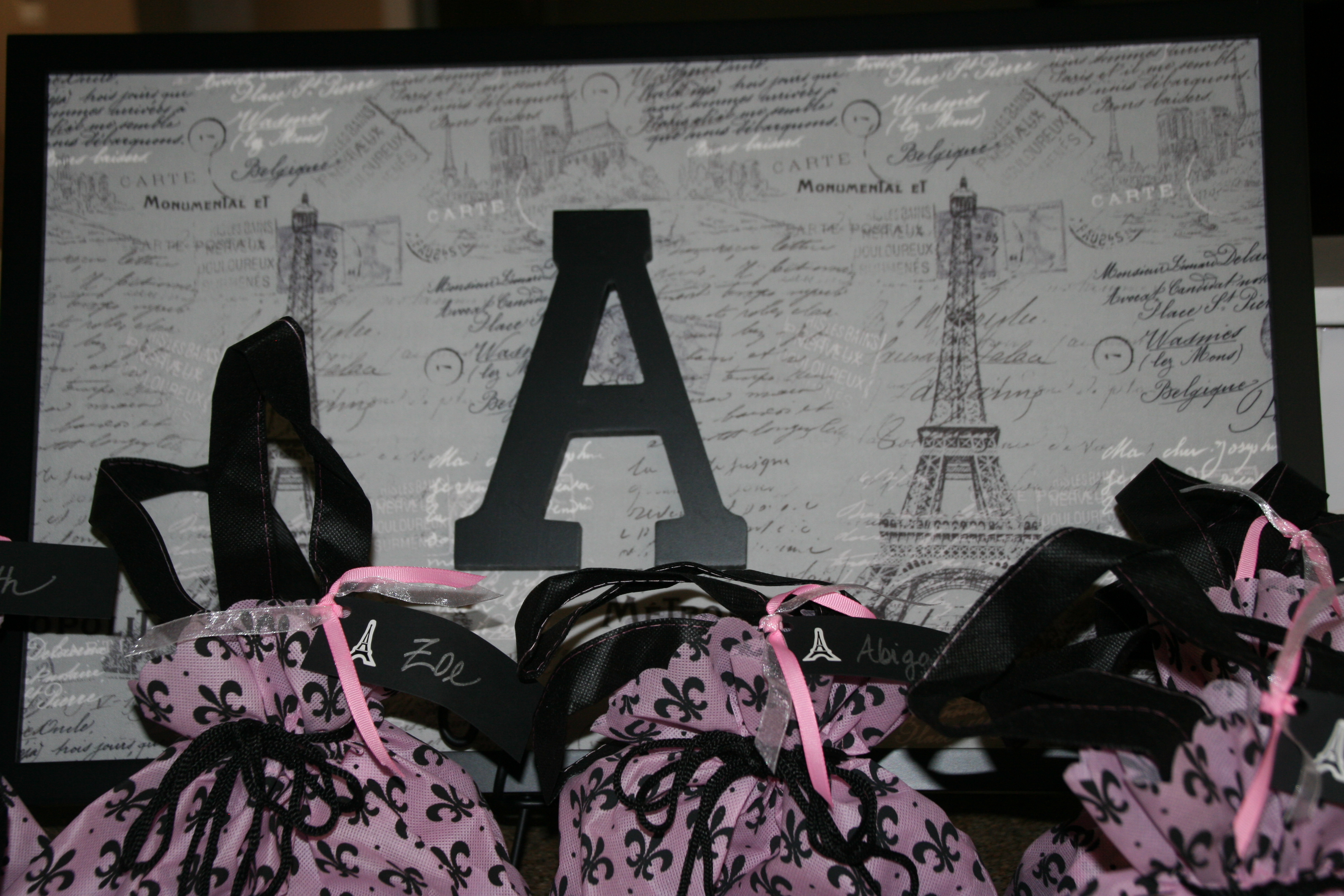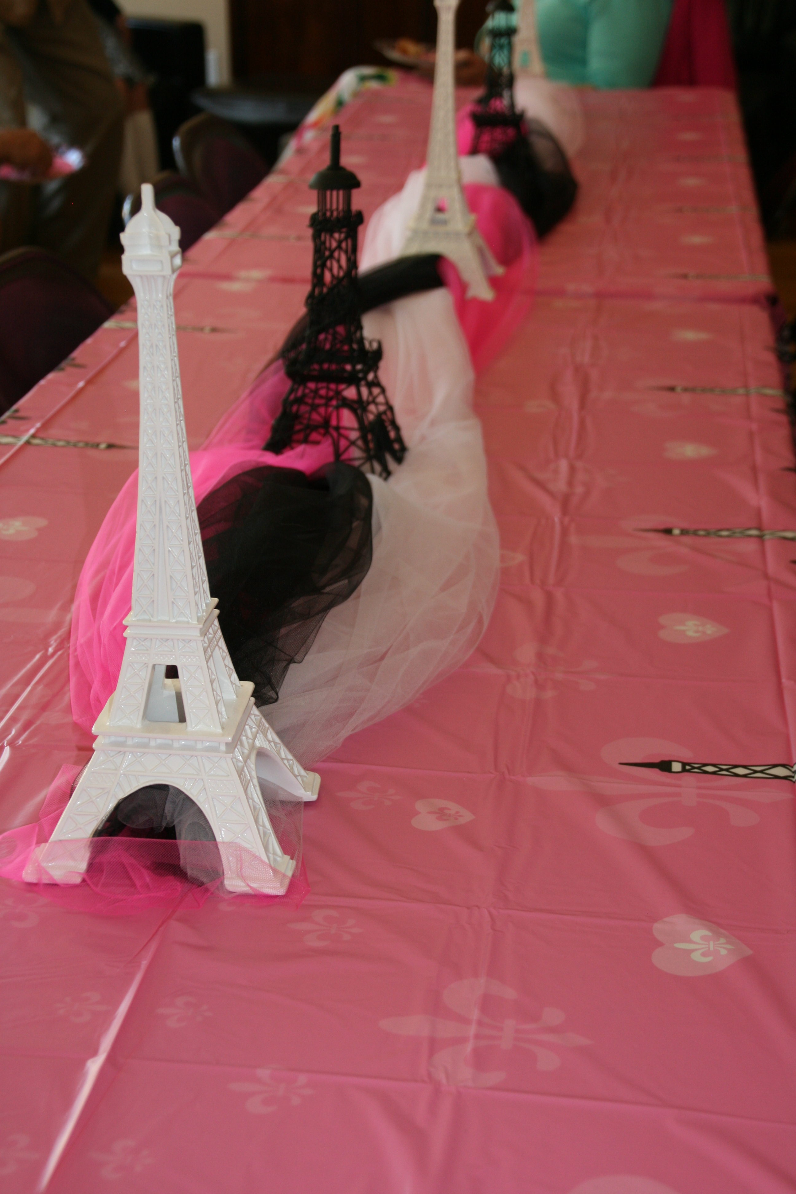 The table decor was simple…pink, white, & black tulle loosely braided down the center with Eiffel Tower statues in white & black.