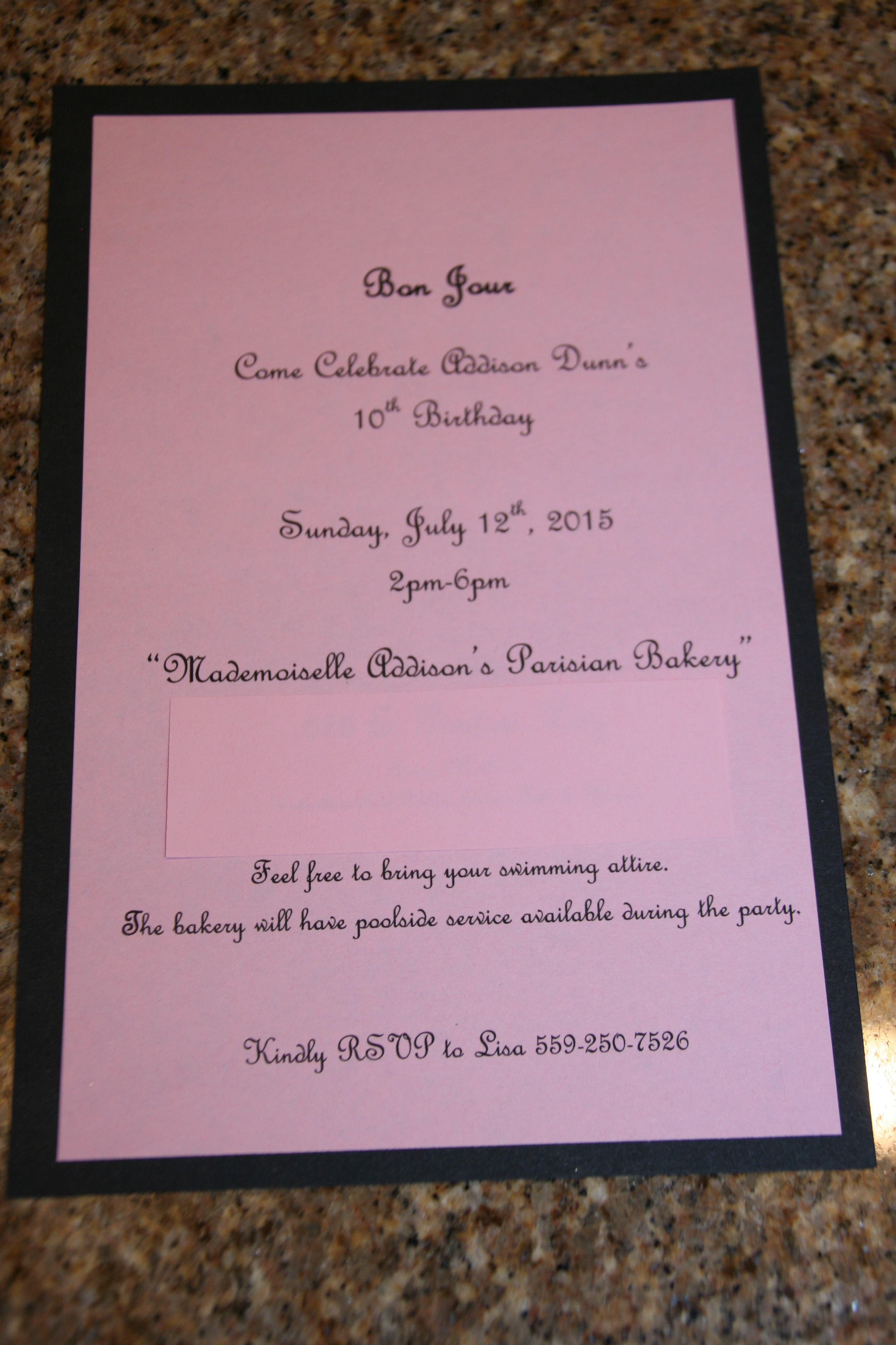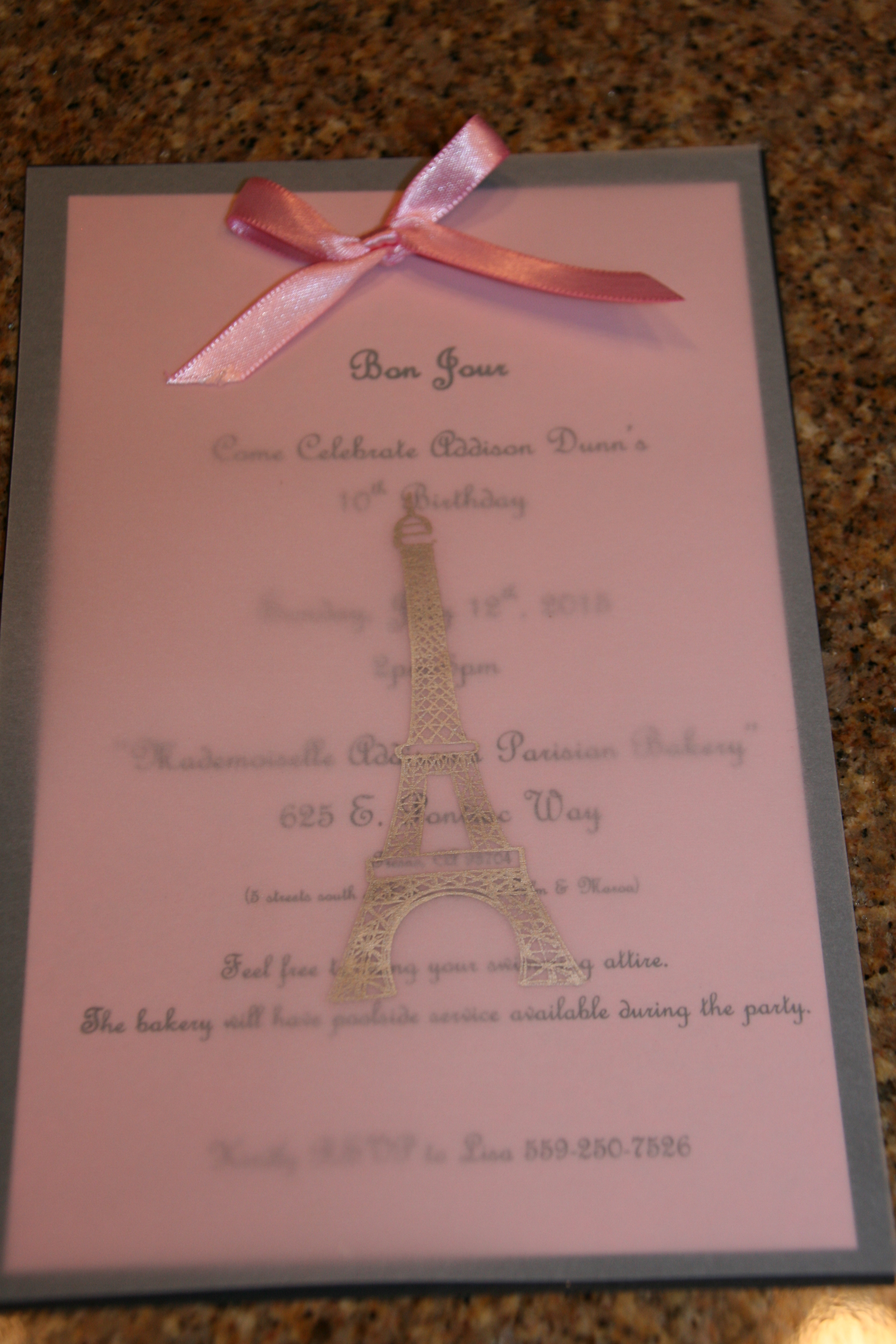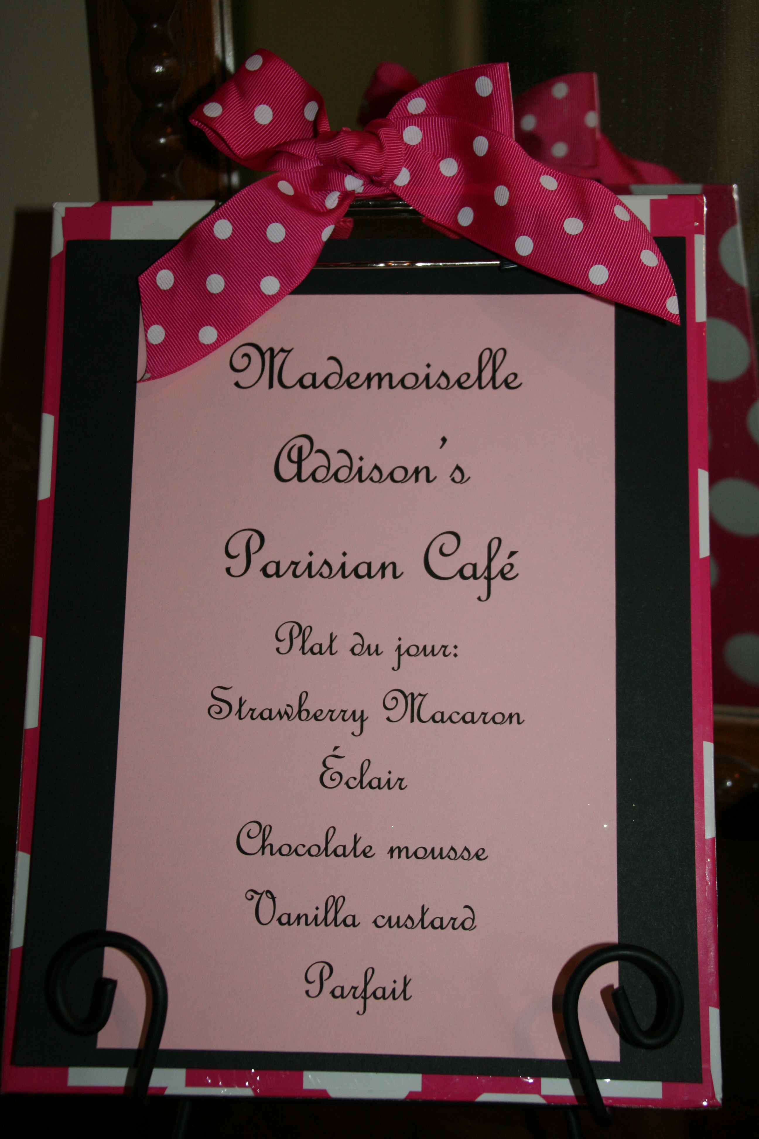 I purchased an Eiffel Tower backdrop at Oriental Trading and used it as a photo booth. The girls had so much fun with the props, including a white board for them to write the reasons they love Paris! The girls topped off the party with a French lesson! Magnifique!