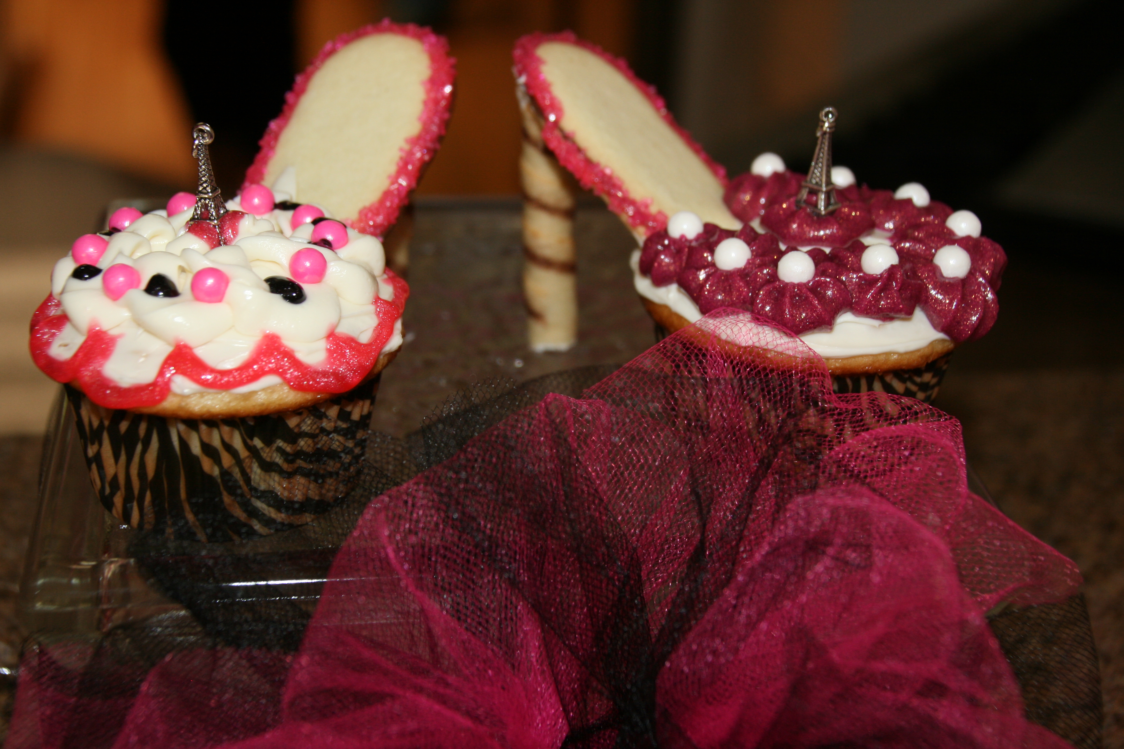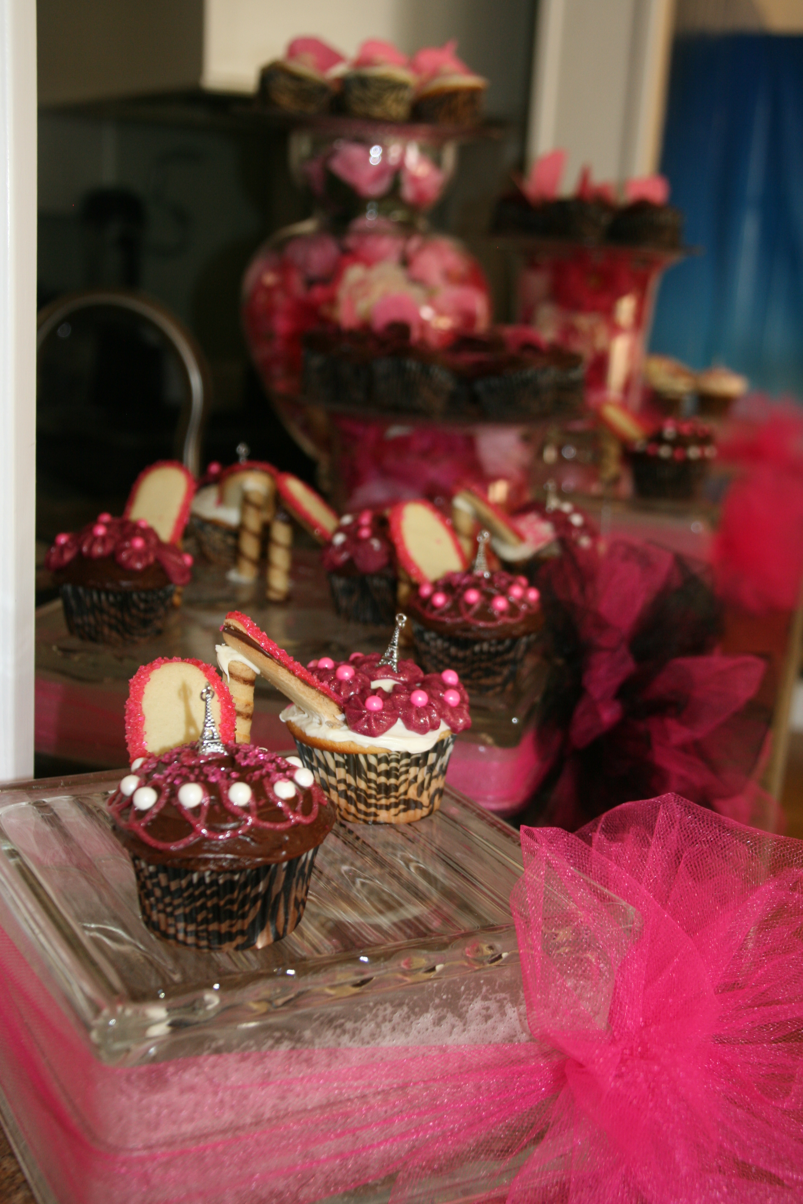I made high heeled shoe cupcakes also and decorated them with an Eiffel Tower charm on top, which was part of the party favor.