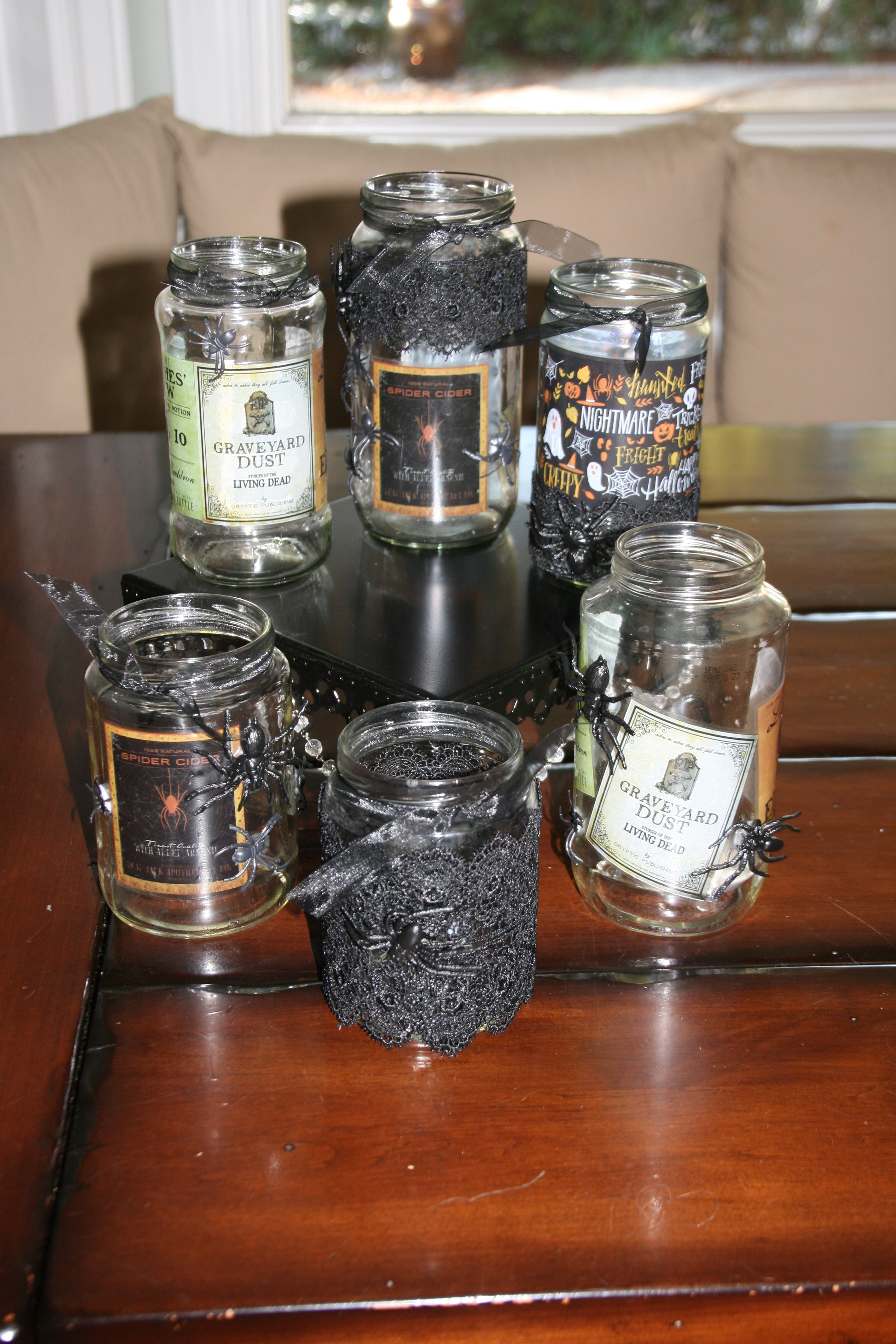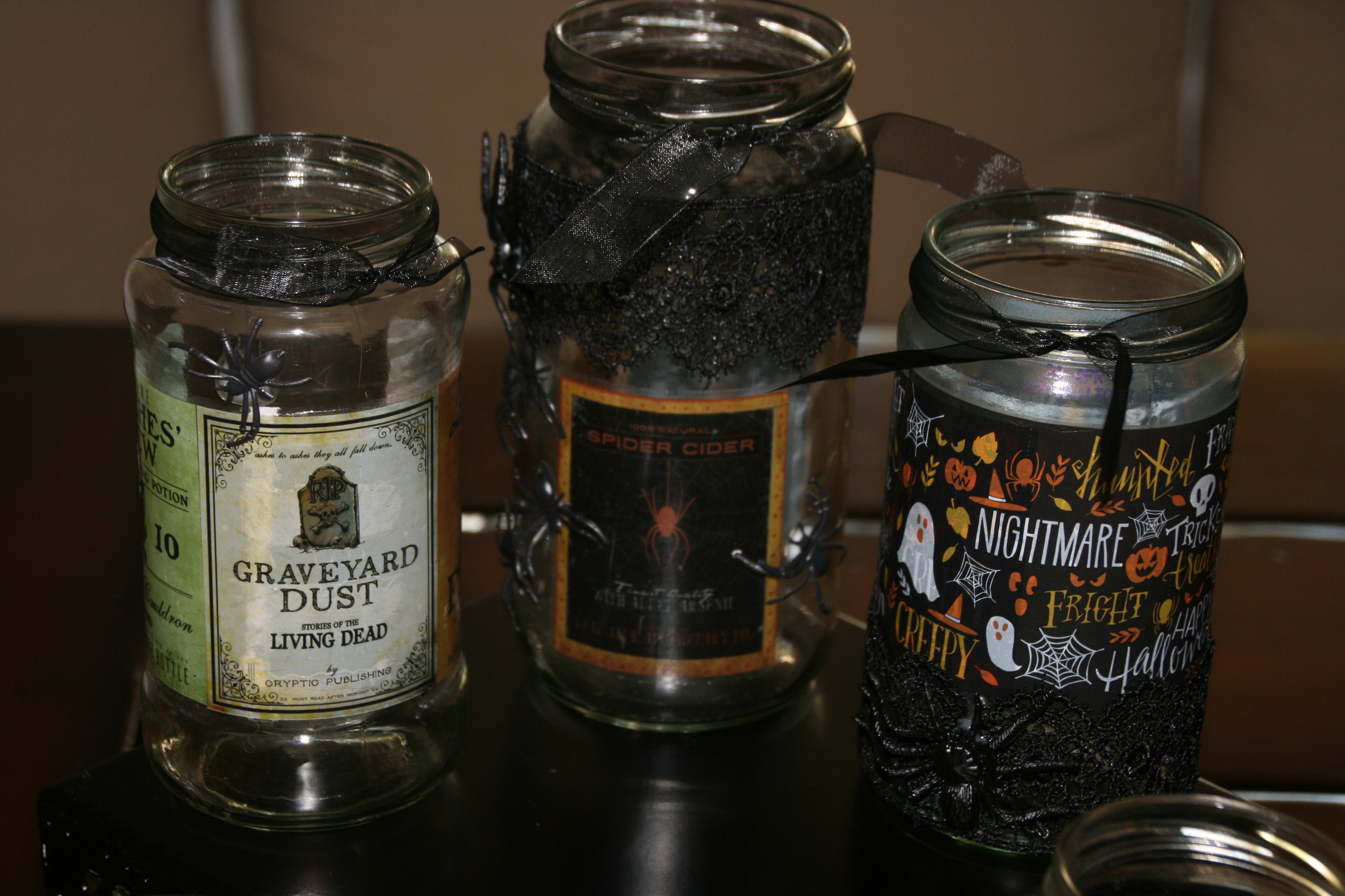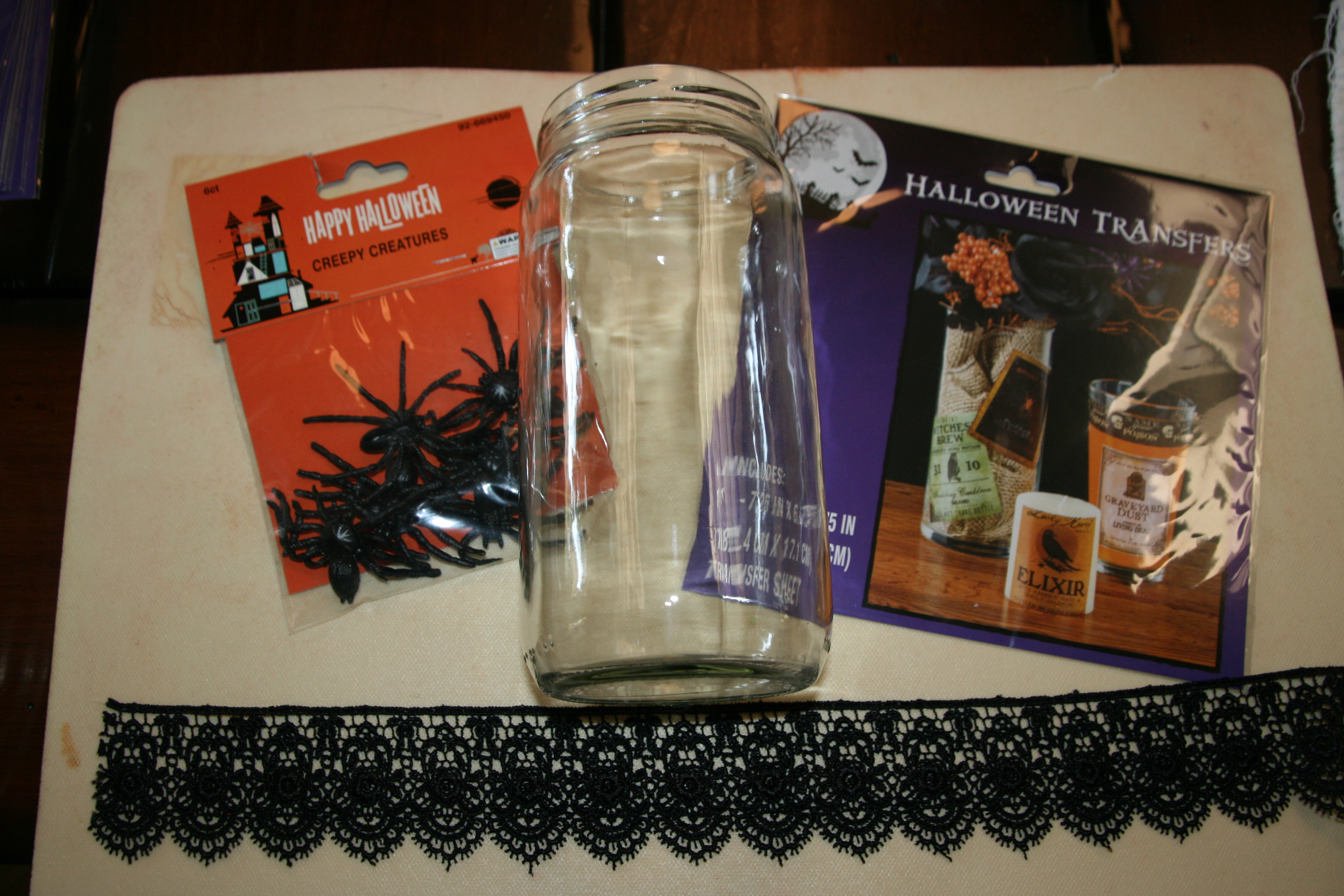 I absolutely LOVE crafting with jars! I save them all year long! I wanted to make some unique Halloween lanterns for teacher gifts and found the perfect lace like ribbon at Hobby Lobby and transfer decals at The Dollar Tree. I purchased the spiders at the 99cent store.