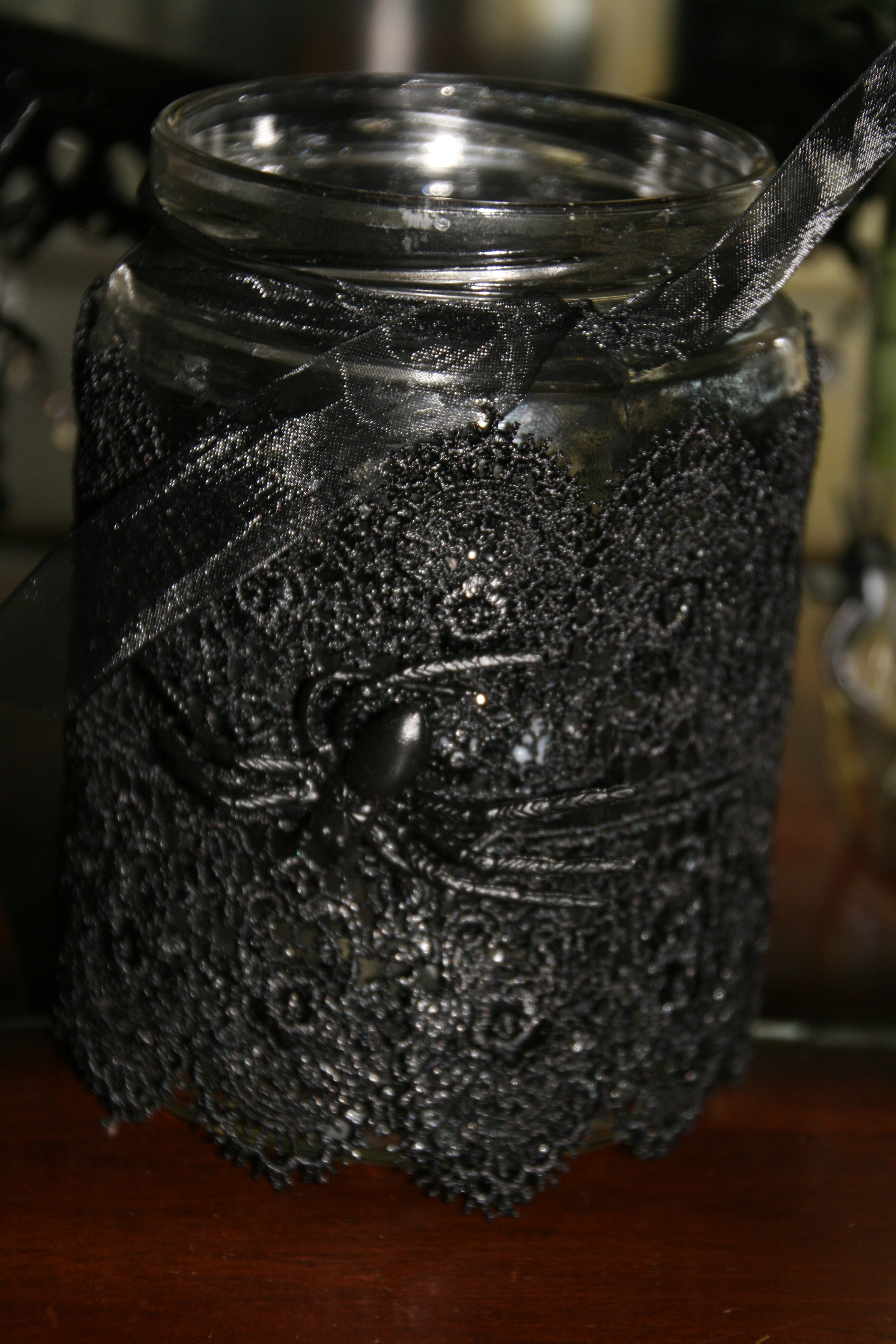Next, glue on the lace like ribbon. I used Tacky glue. Lastly, glue on the spiders. I started with Tacky glue, but found that E6000 glue worked better. Finish with a knotted ribbon around the top of the jar.