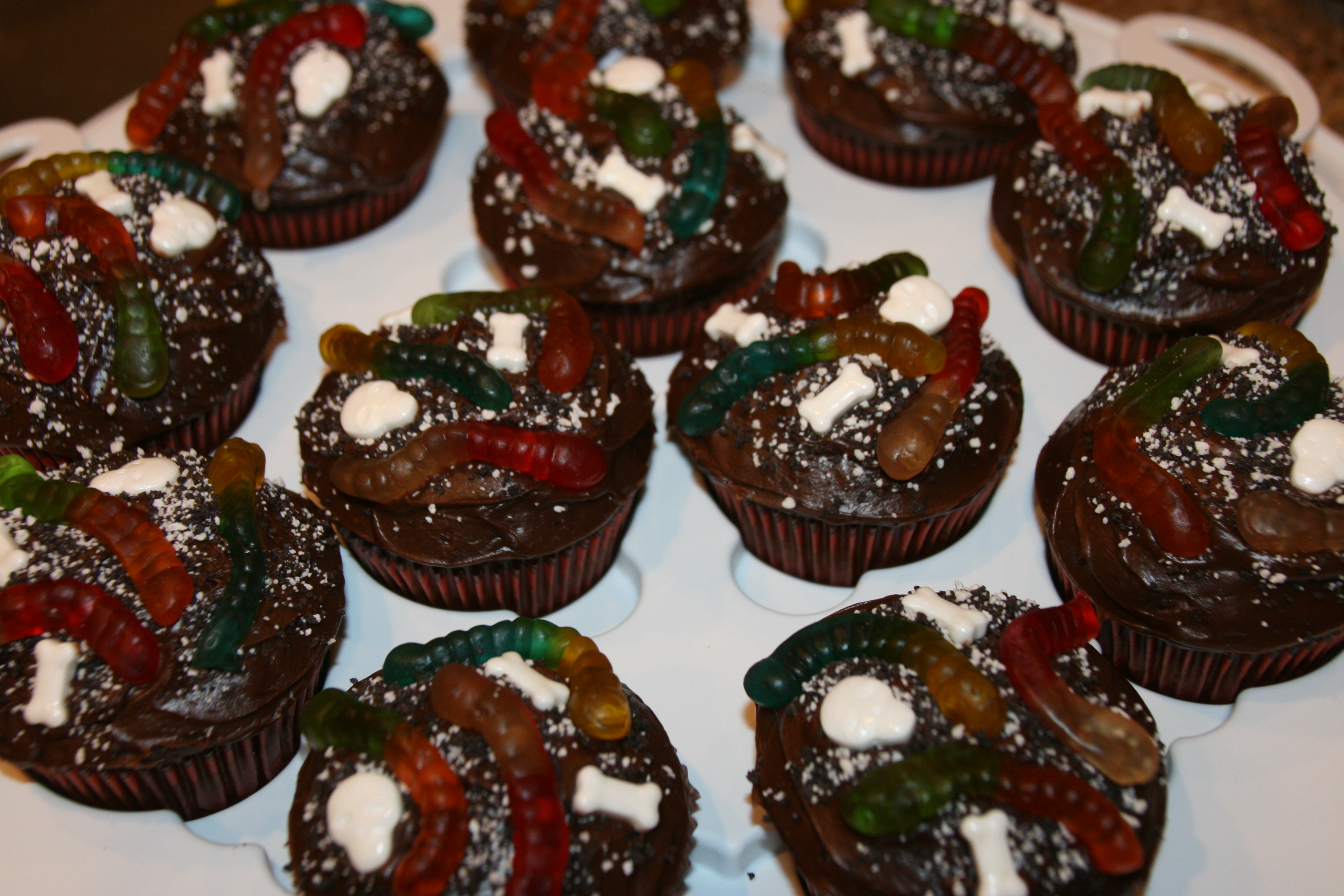 I used Wilton “cookies and cream” sprinkles to create the “dirt”, gummy worms, and skull & bones candy I found at the 99cent store.