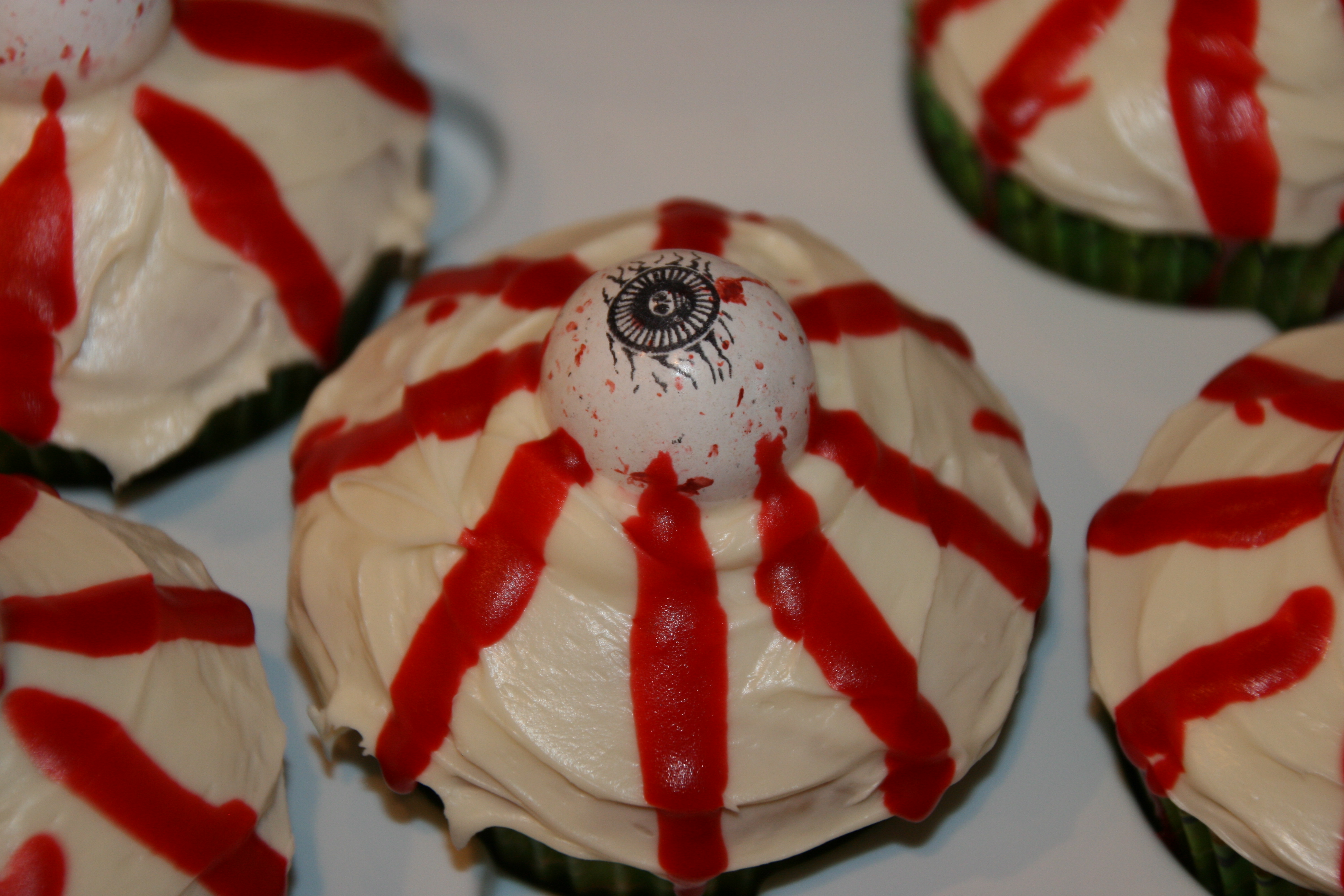 I used skull eyeball gumballs that I purchased at Walmart and red icing. I heated up the icing so it would run as I dripped it onto the cupcakes.