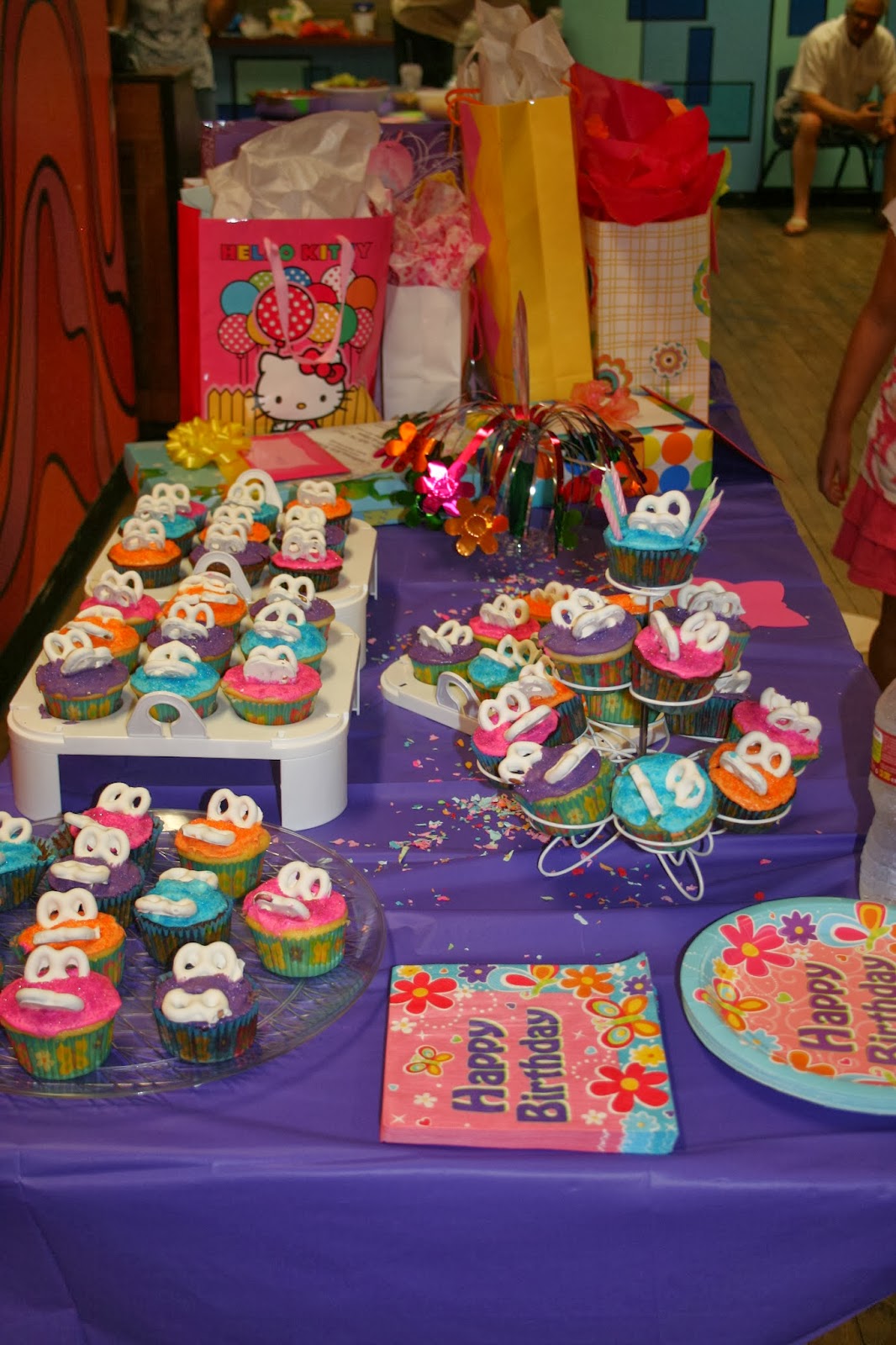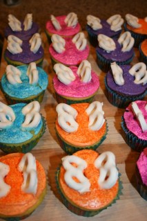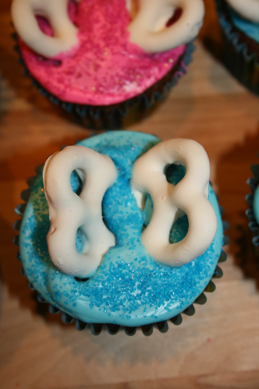 The cupcakes were blue & purple swirl. I mixed food coloring into the cake batter. I topped the cupcakes with vanilla frosting and a variety of candies to make them look like ice. Candies included cut sour blue licorice, Sixlets, small blue & white pearls, rock candy topping, and blue & purple sprinkles.