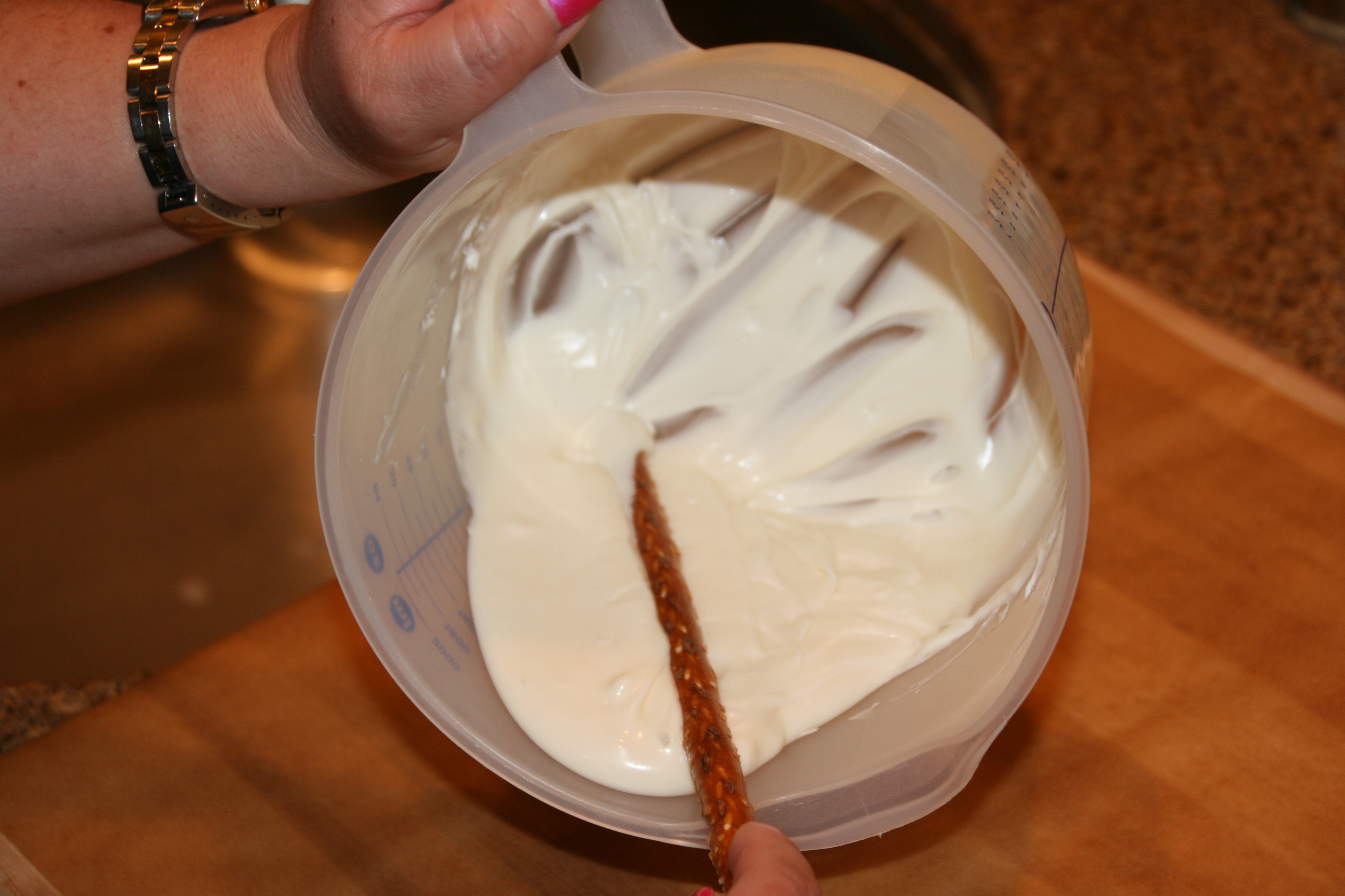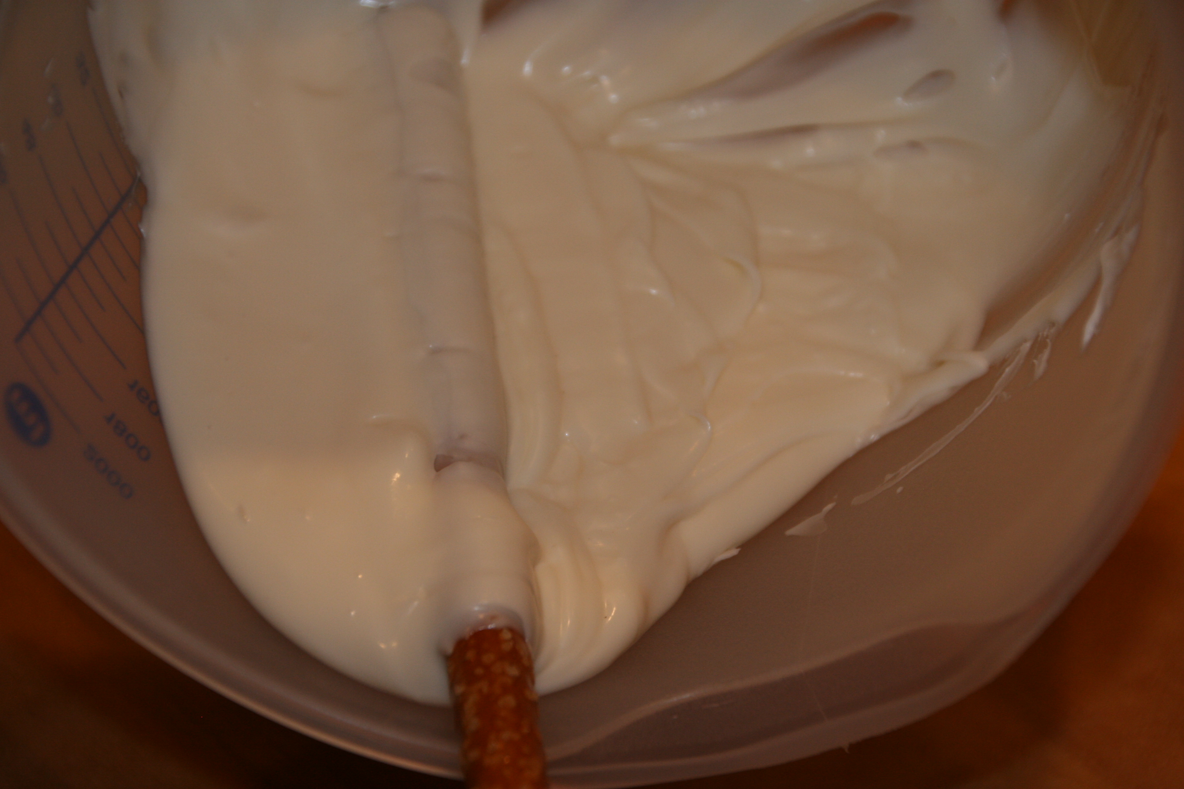 Start by melting the Chocolate Melts as the directions specify. Once the chocolate is melted, individually dip the Bugles into the chocolate. Gently use your fingers to remove the Bugle, shake off the excess chocolate, and place on parchment paper to dry. If you want a drizzle, as I did here, melt a different color of chocolate and dip a fork into the chocolate. Shake the fork over the Bugles to create the drizzles. Let the Bugles dry.
